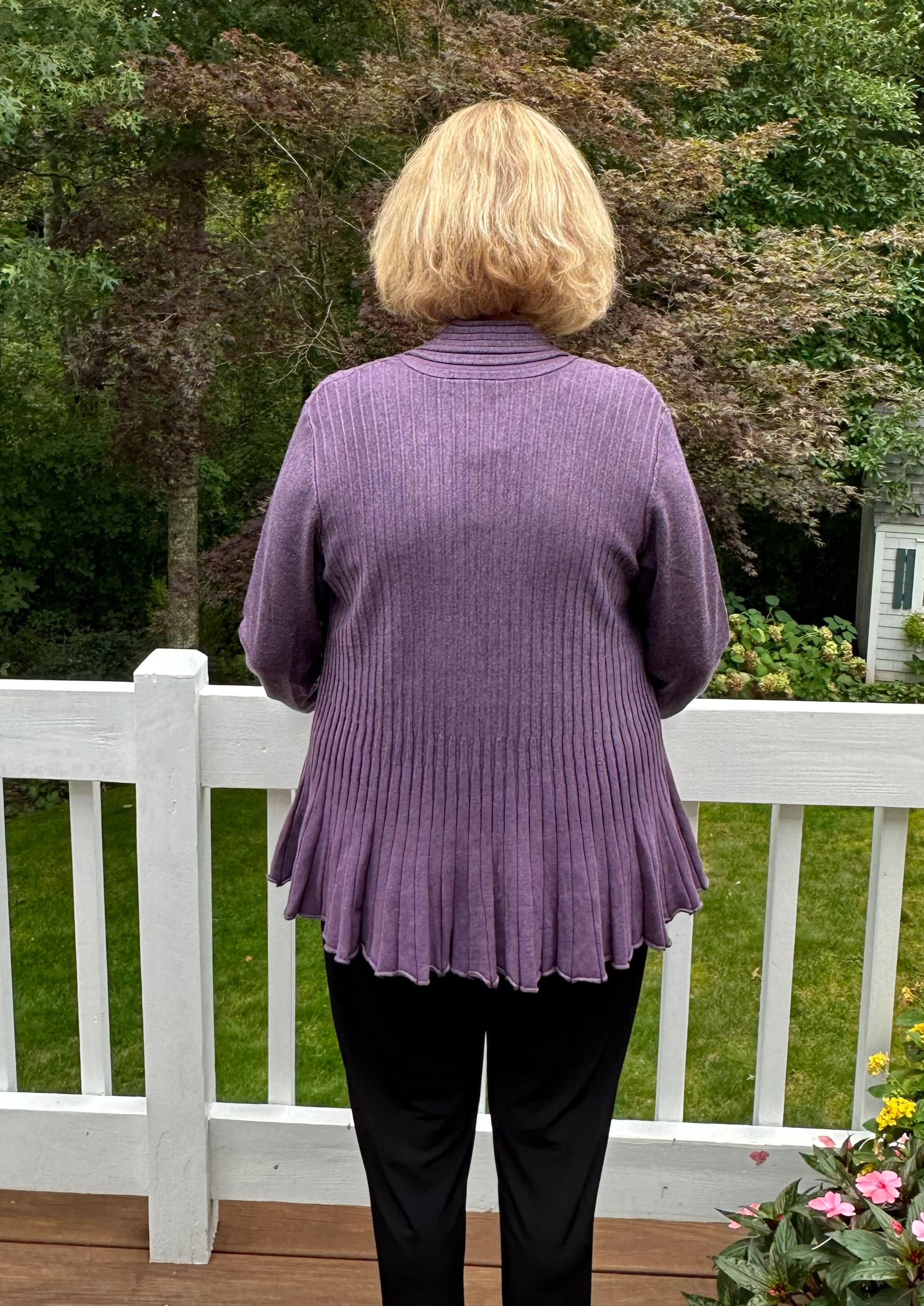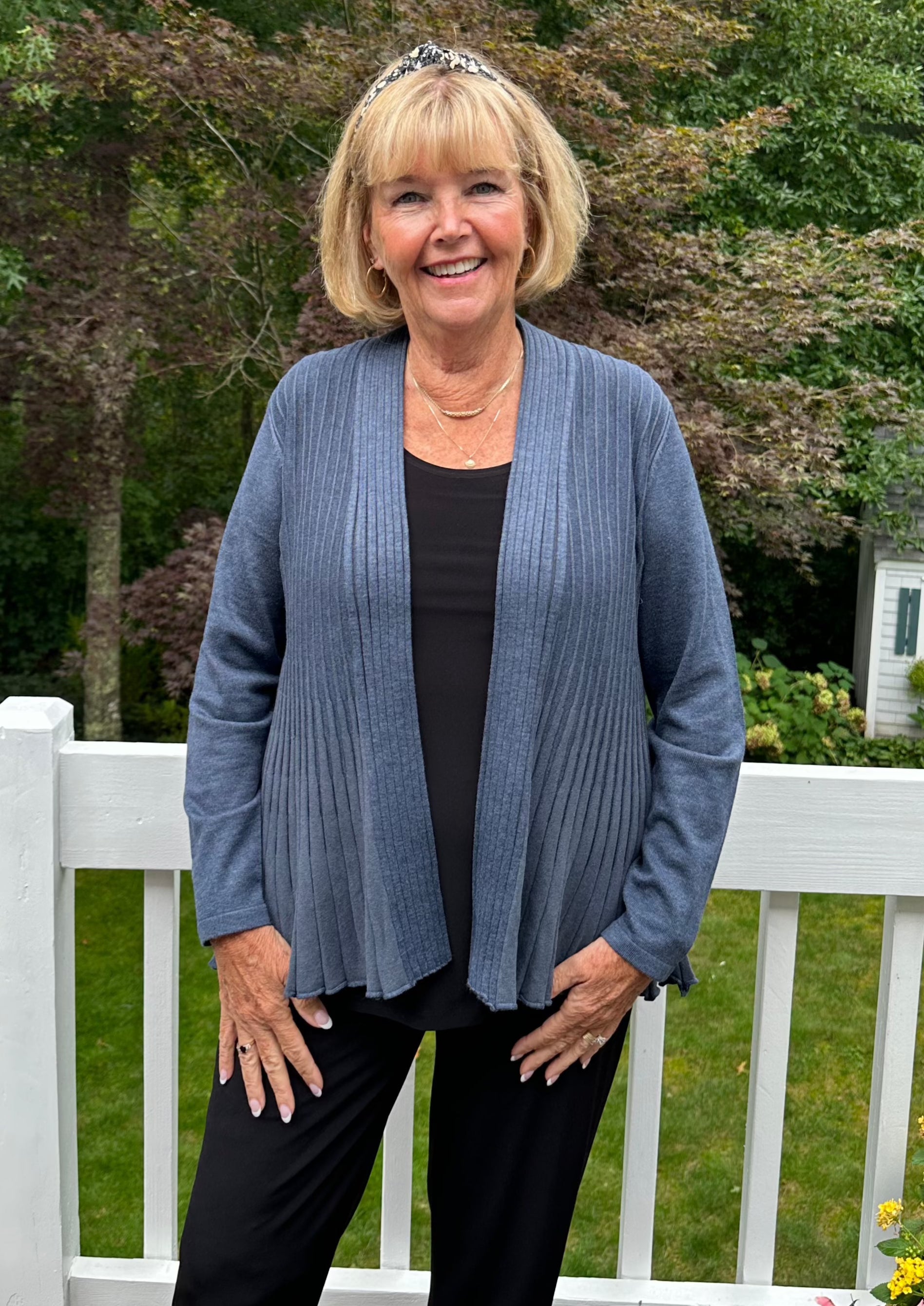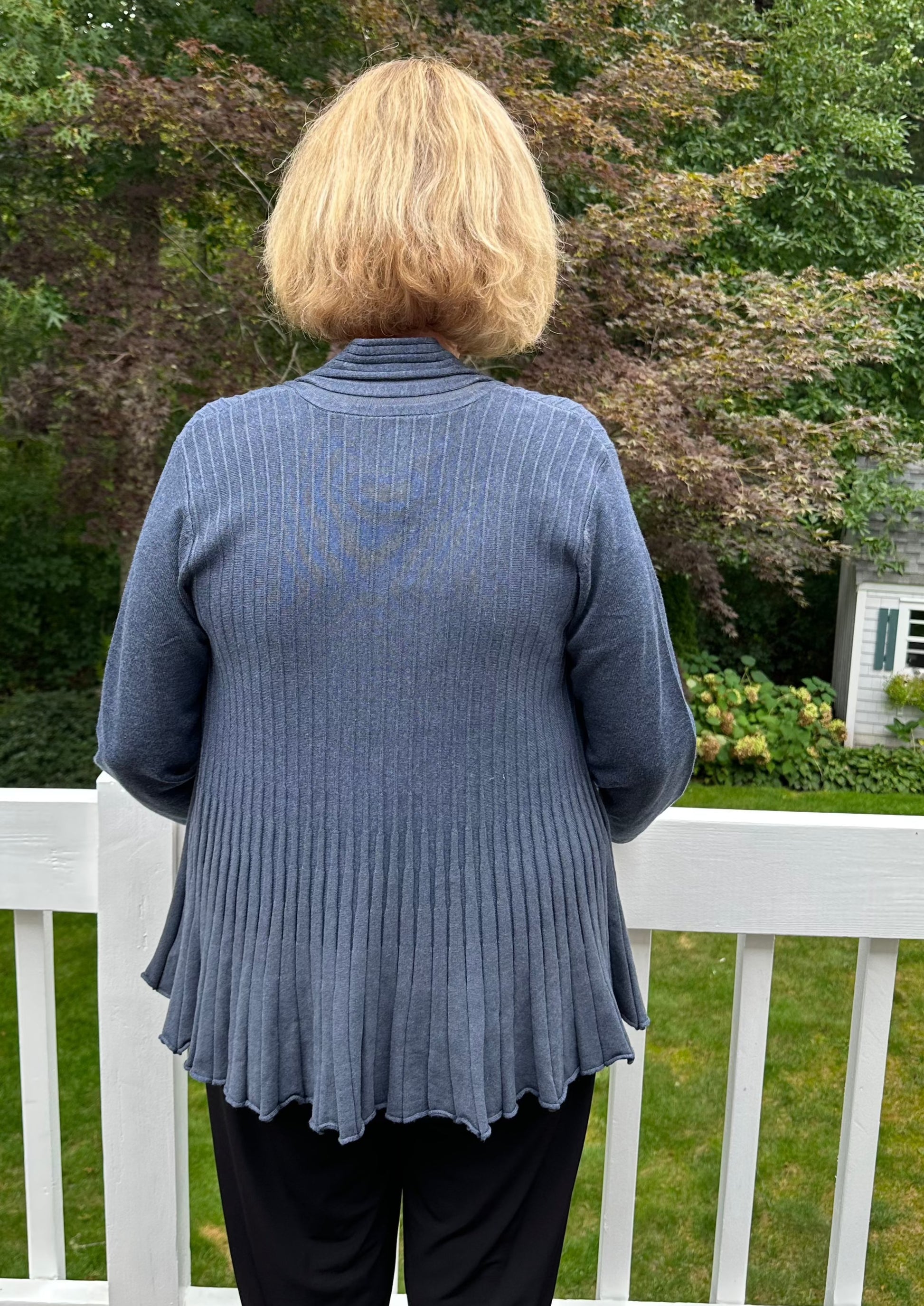 A lightweight ribbed cardigan sweater from Sunday by Godske. The flowing vertical lines finish in a flirty hem.