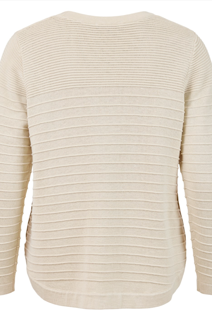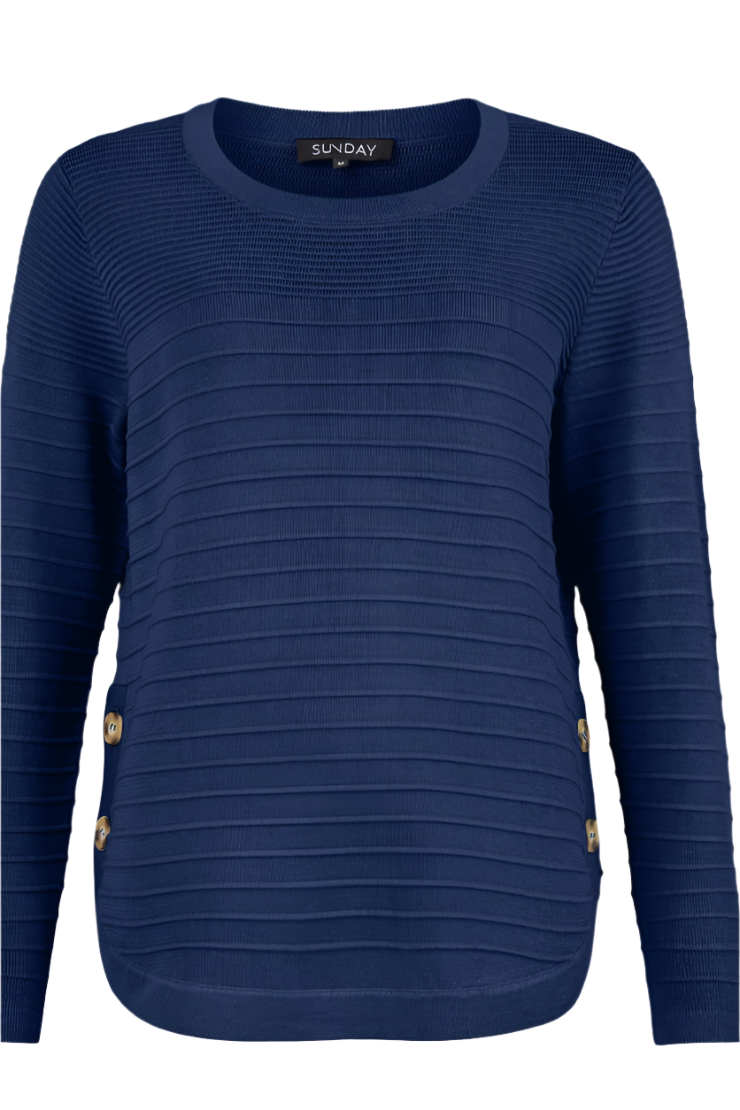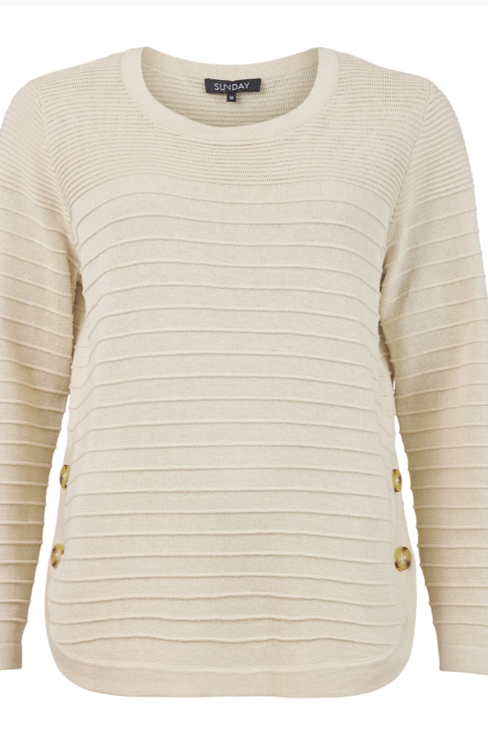 Elevate your spring/summer sweater collection in this Ottoman stitch pullover from Sunday by Godske. Features a round neck, long sleeves and flattering curved hem with button detail.