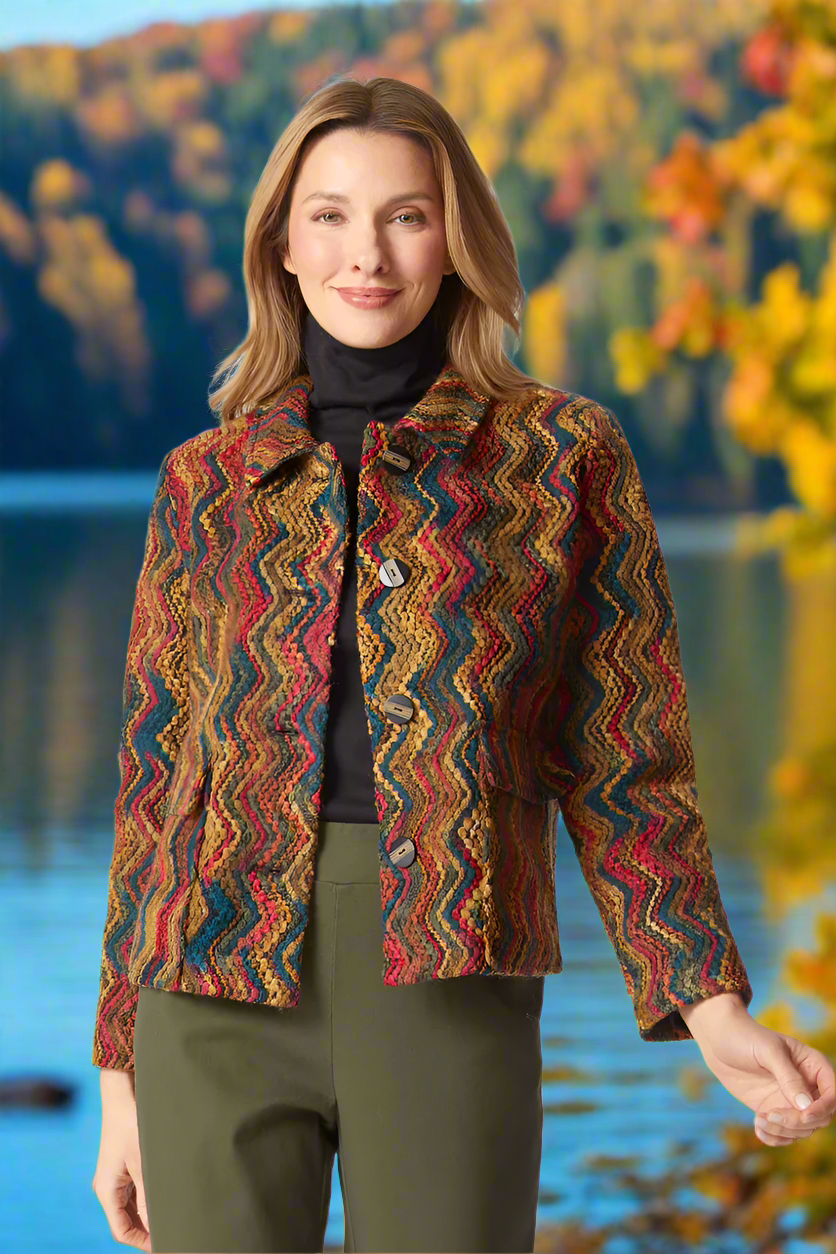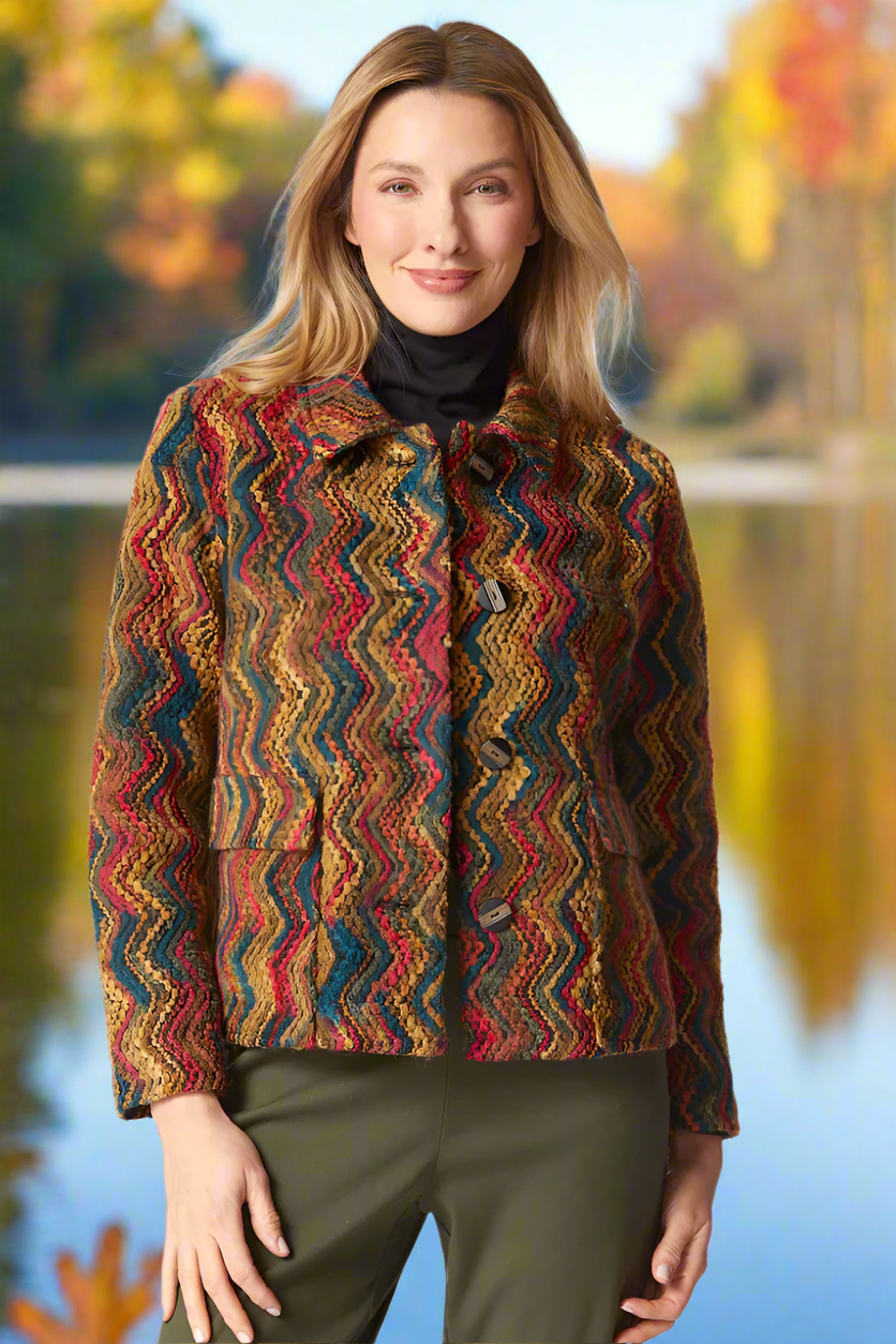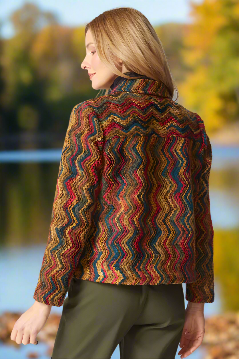 Beautiful nubby yarns in a rainbow of colors make this a standout piece for fall and winter. The button-front and folded collar offer a tailored, polished look, while flapped patch pockets and long sleeves balance utility with sophistication. With a classic cut reimagined with vintage-inspired details, it’s a versatile statement piece that elevates any ensemble with artisanal charm.Comfortable fit for everyday wear