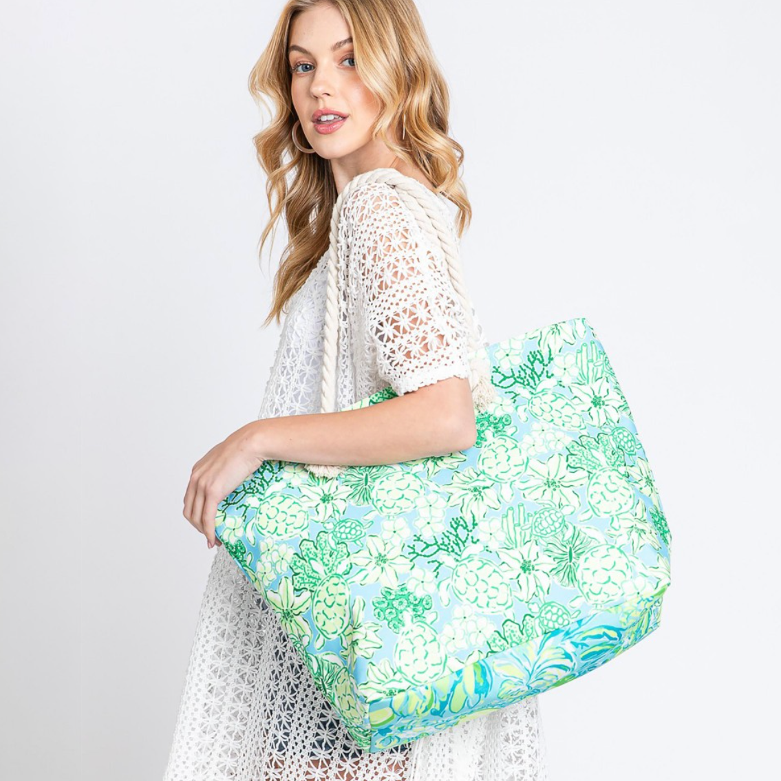 Floral Turtle Print Tote Bag With Soft Rope Handle