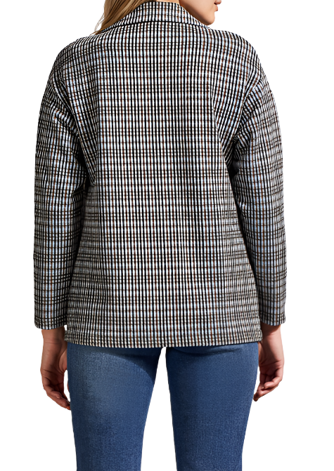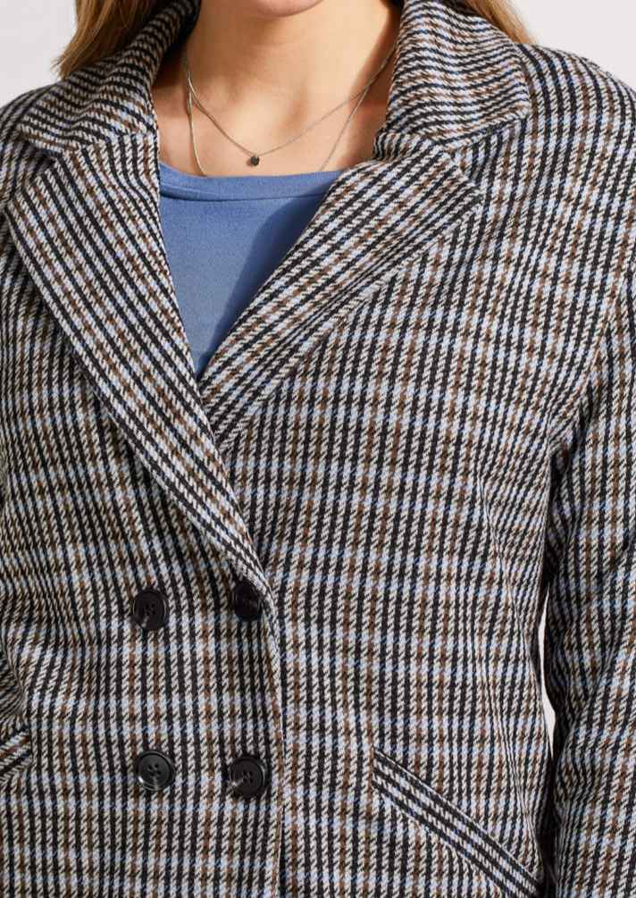 Embrace timeless sophistication in our figure-flattering double-breasted blazer, designed to enhance your natural silhouette. Featuring a sharply styled notch collar, an unlined interior, and functional welt pockets, it exudes refined elegance. With a length of 28 inches, it delivers a polished look suitable for any occasion. Crafted from brushed knit fabric adorned with a versatile plaid pattern, this blazer effortlessly blends style and versatility.