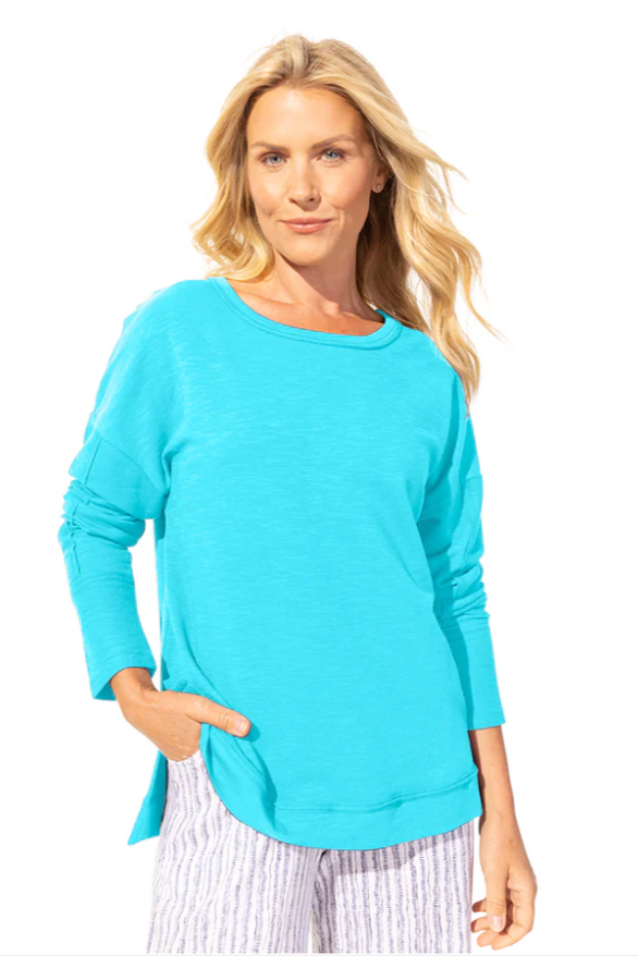 Introducing the Escape By Habitat Modal Span Terry Sand & Sea Pullover. Perfect for a day at the beach or a casual outing, it's a must-have for any wardrobe. Stay effortlessly chic while feeling relaxed and cozy.