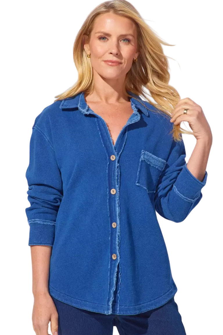 - Frayed-edge detailing along the collar, placket, cuffs, and pocket for added texture