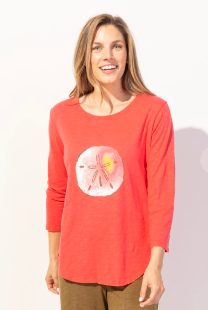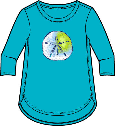 The weekender tee with hand-drawn sand dollar art is the perfect tee for a bit more coverage without looking baggy.