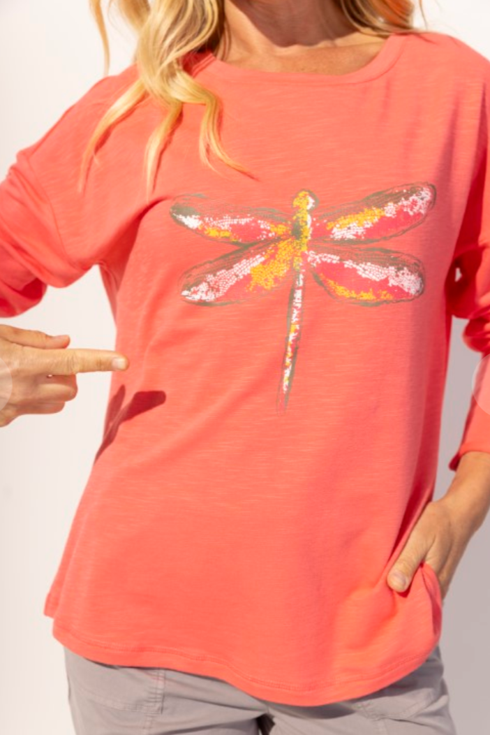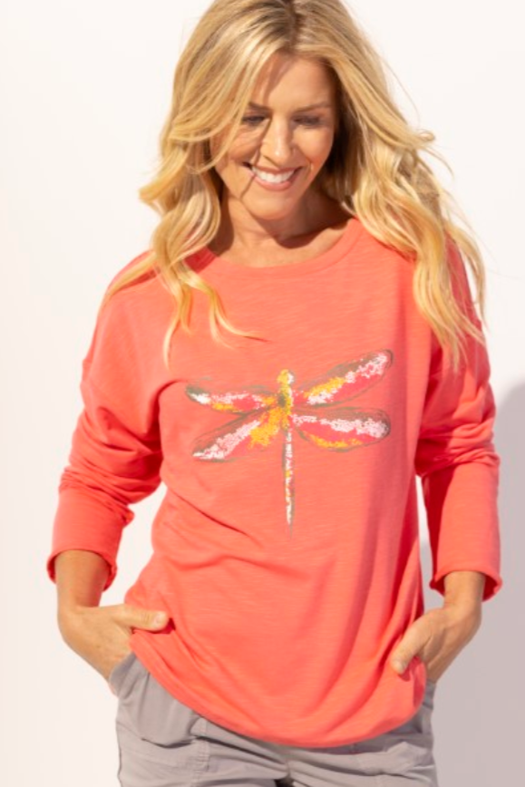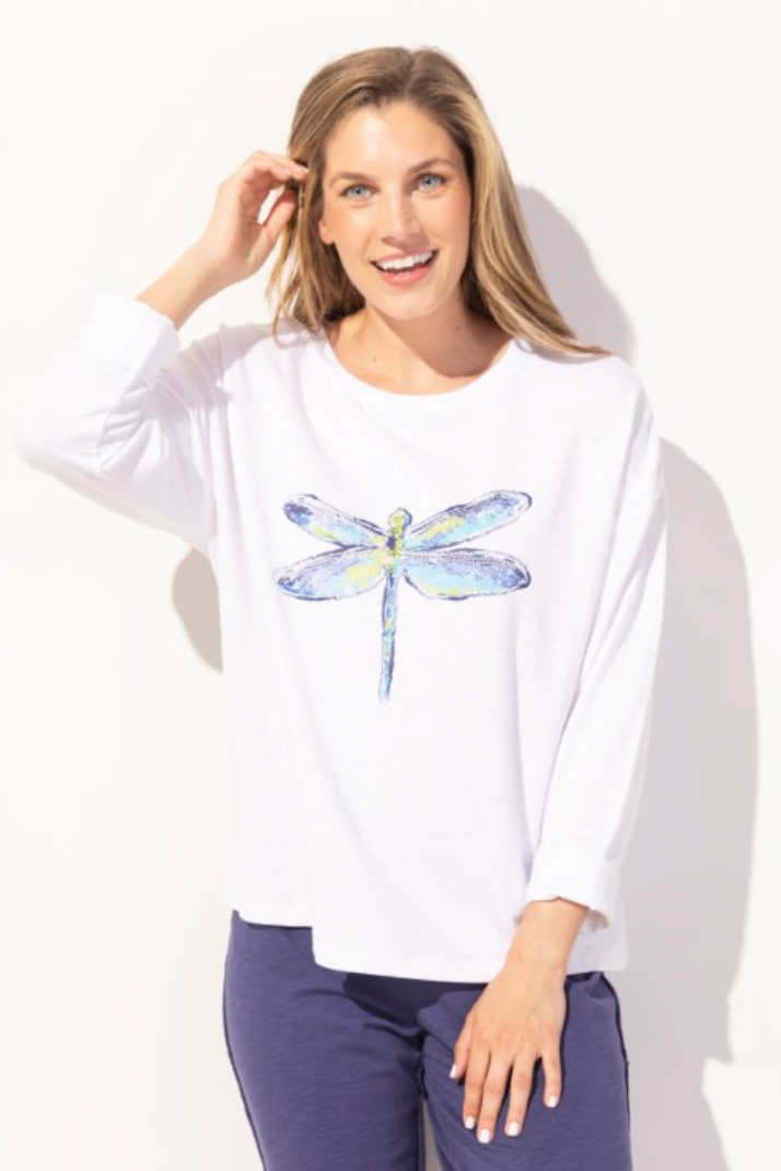 The dragonfly represents hope, change and infinite possibilities. Our hand drawn cluster of fossil like dragonflies adorn this Peruvian cotton long sleeve tee. Destination tops all feature Escape’s unique screen prints. The lightweight terry pullover is 100% cotton, with drop shoulders and an relaxed fit.