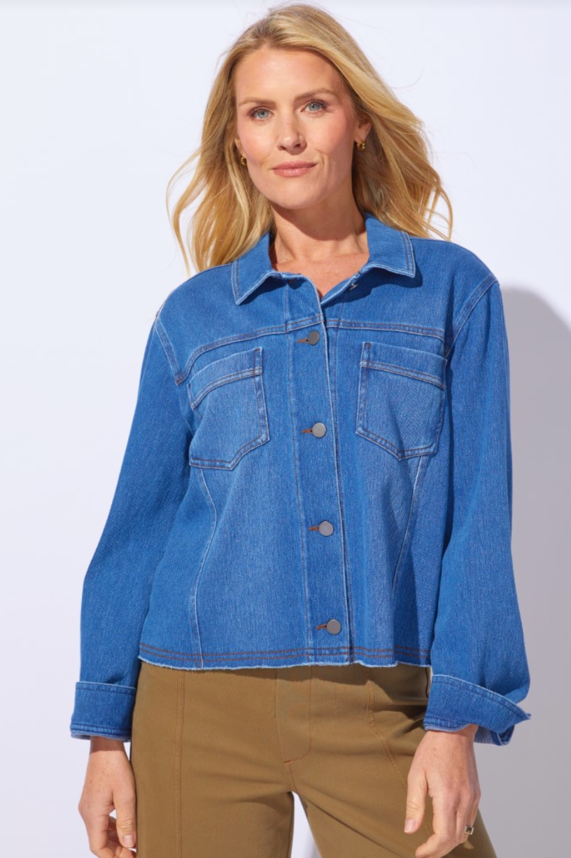 Stretch denim jacket with front button closure. Features full length sleeves, collar and a fashionable raw edge hem.