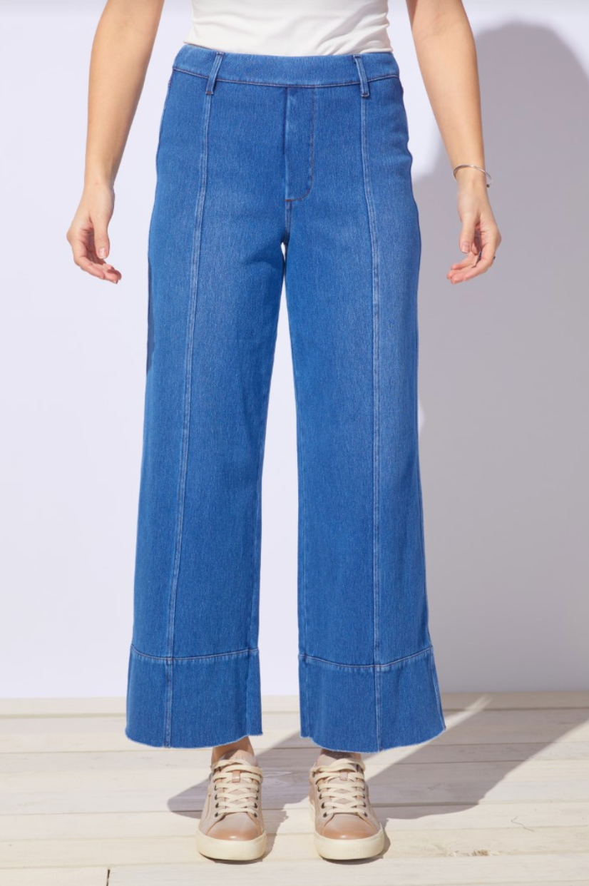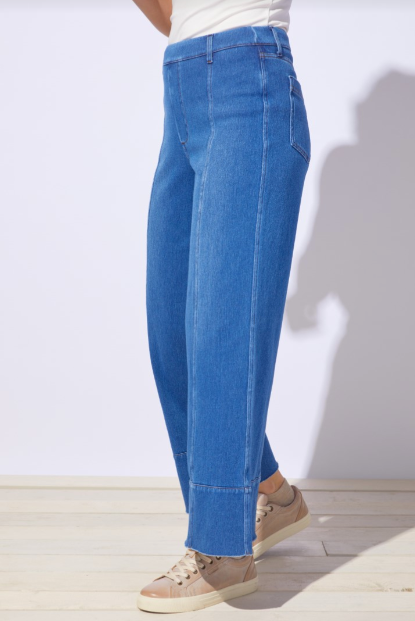 Casual and cool, this denim pant blends easygoing comfort with a modern silhouette. The relaxed straight leg and raw-edge hem create a laid-back feel, while the front seam detail adds structure and style. Designed with a wide hem band, flattering back pockets, and a smooth pull-on waistband for everyday wearability.