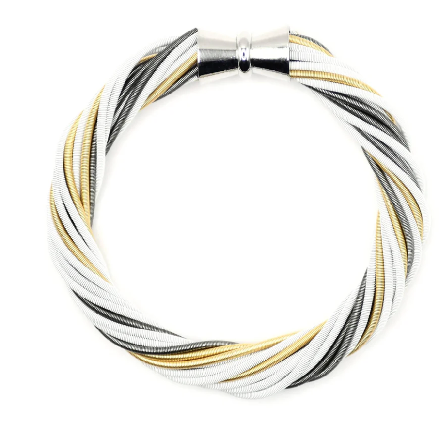 Multi color twist style piano wire bracelet in White, Gold & Slate with magnetic clasp