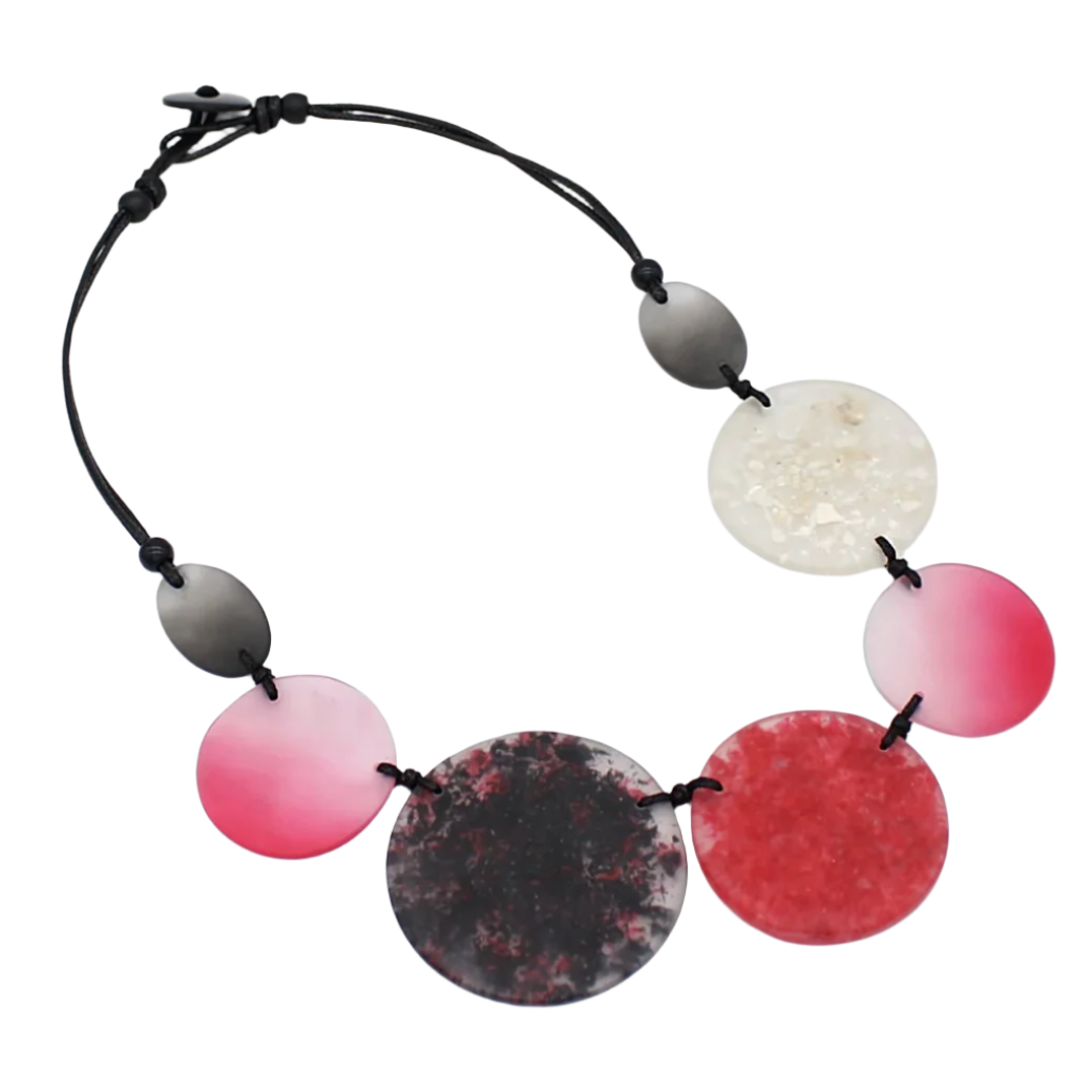 This frosted resin necklace is made to enhance your neckline. Oval resin beads in shades of red, black, gray and white are filled with raffia for a shimmery look. This necklace is finished with a button closure and hangs perfectly to make your neckline pop. Layer this necklace over a v-neck cocktail dress for a fun night out!