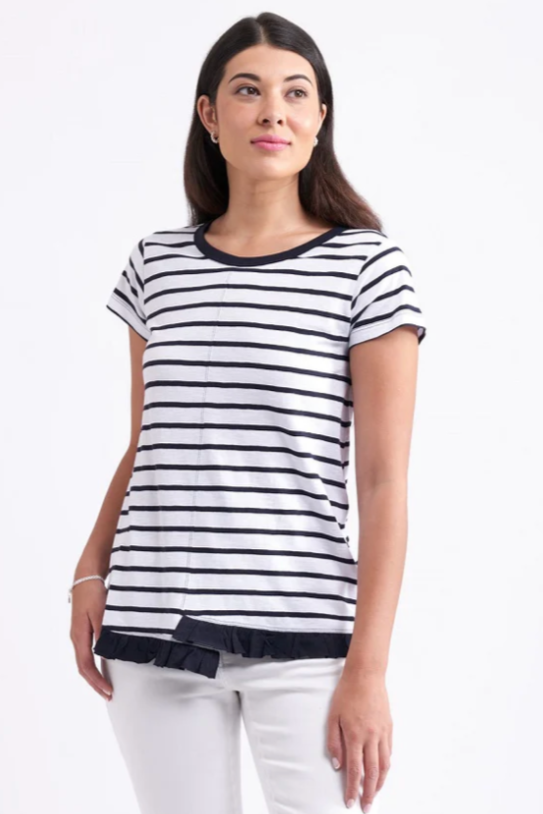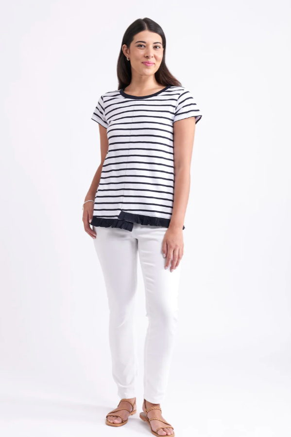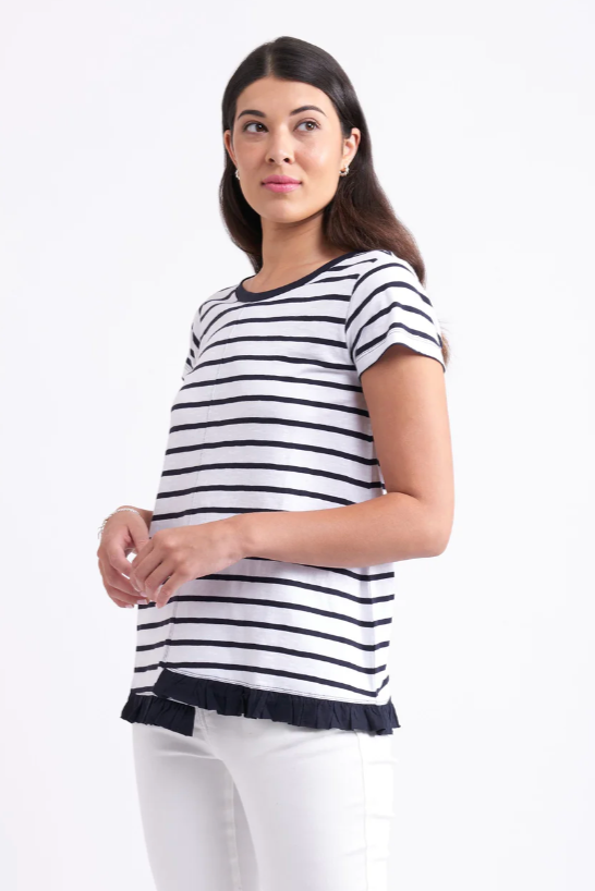 The return of a customer favorite! What a fun tee to add to your summer wardrobe. The step hem with frill is a very stylish way to elevate the look of this tee. Shaped to flare slightly from the bust. Features a cap sleeve and round neck.