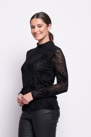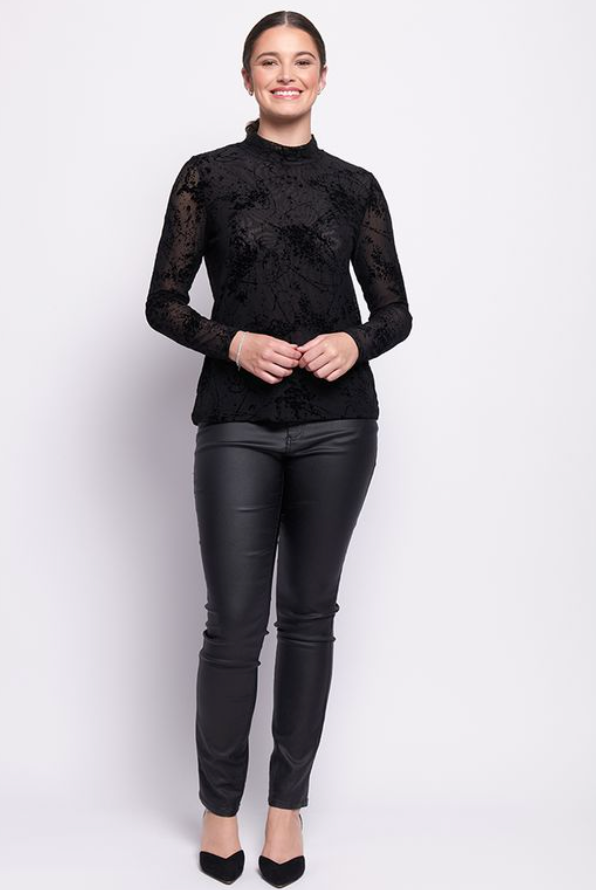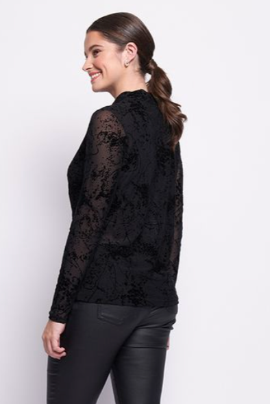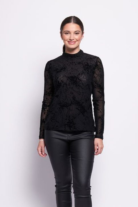 Introducing the stylish International Velvet Top by Foil. This mesh crew neck top features long sleeves and is the perfect winter piece. The Splatter Black velvet print material is both flattering and on-trend. Elevate your wardrobe with this new addition from Foil.