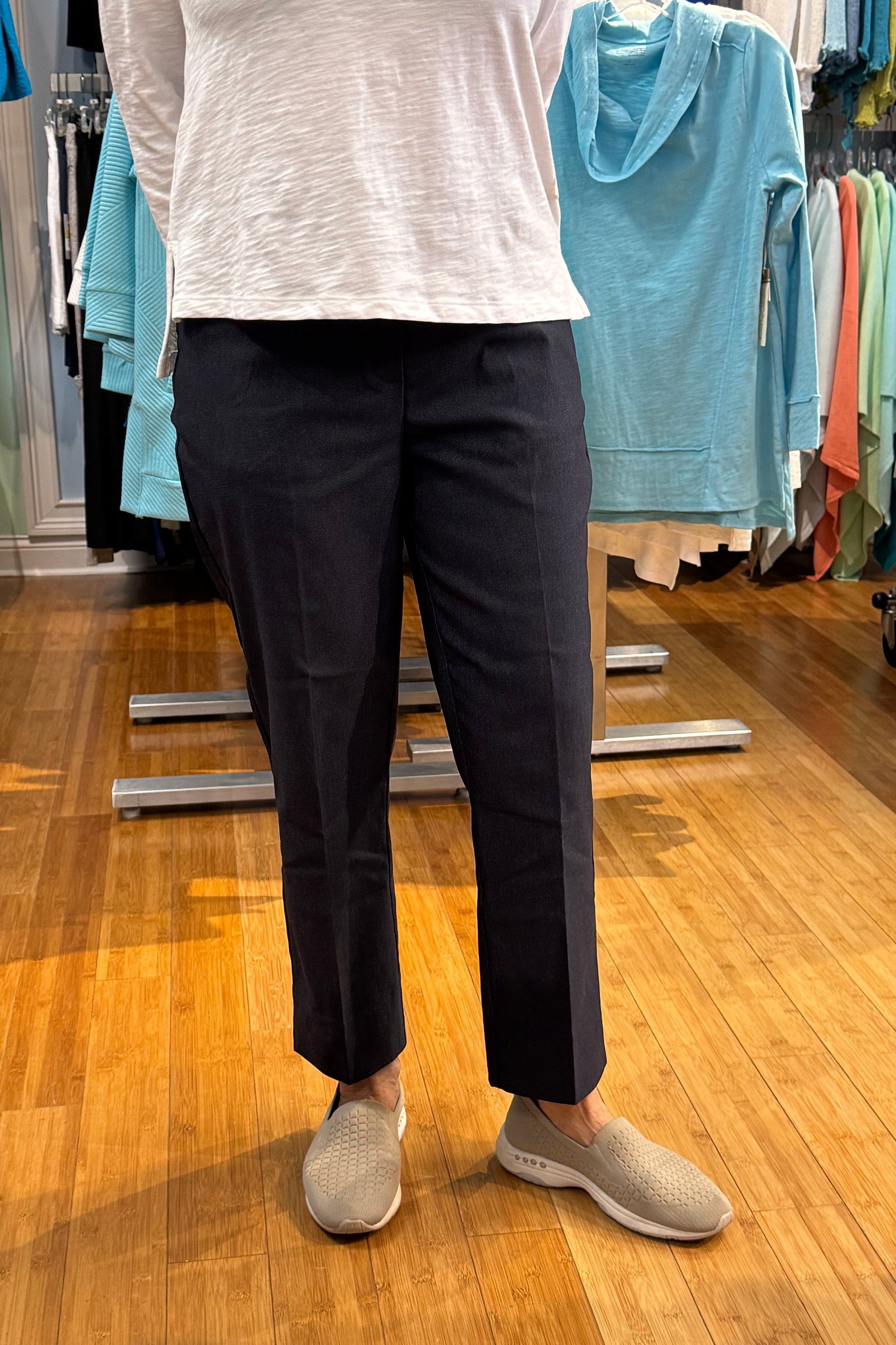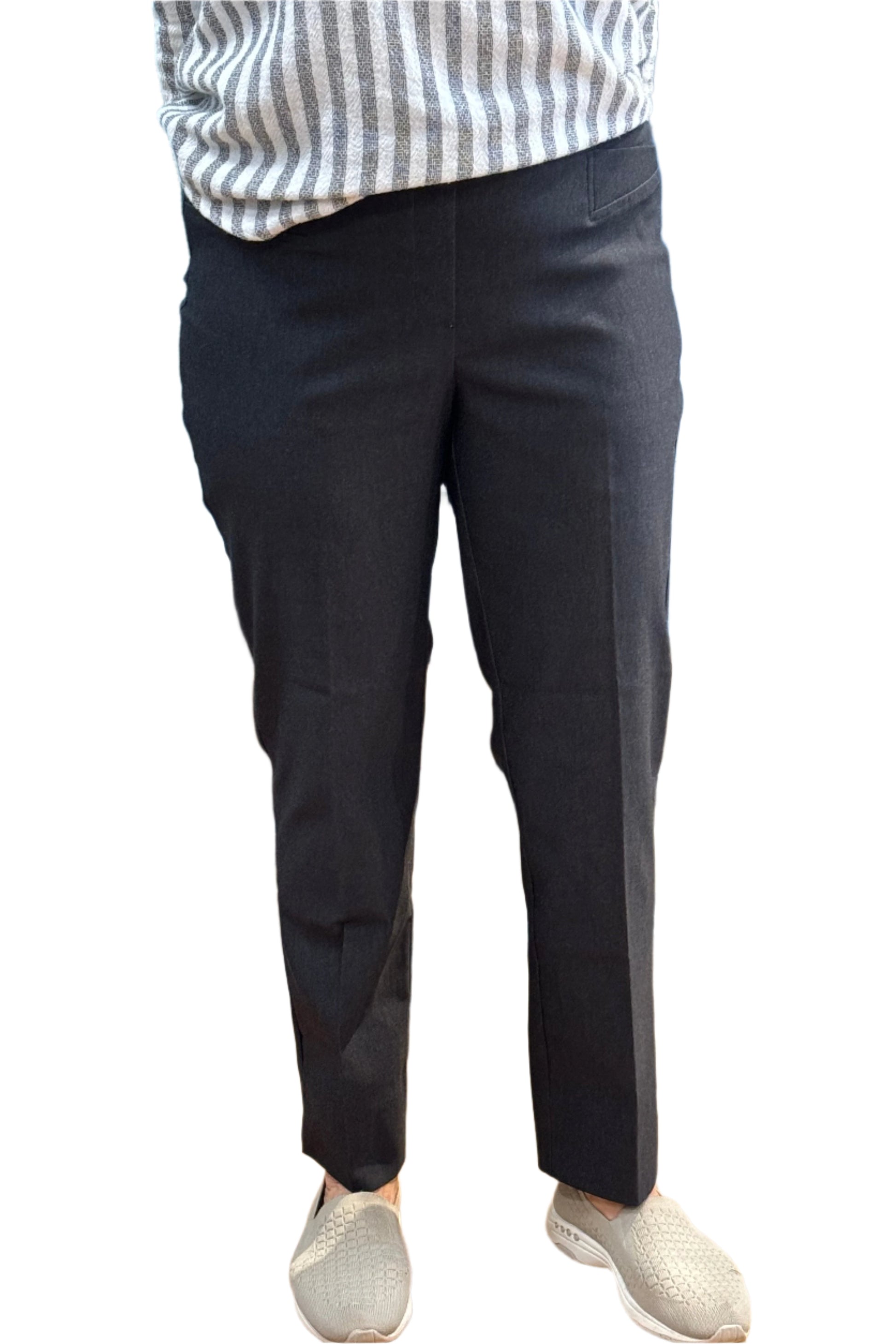 Always comfortable with a crisp look, this stretchy pant bounces back to its original shape to prevent sagging and wrinkles. The modern slim fit with a cropped leg is office appropriate. With front pockets and a smooth elastic waist, these are pants you'll wear well beyond 9:00 - 5:00.
