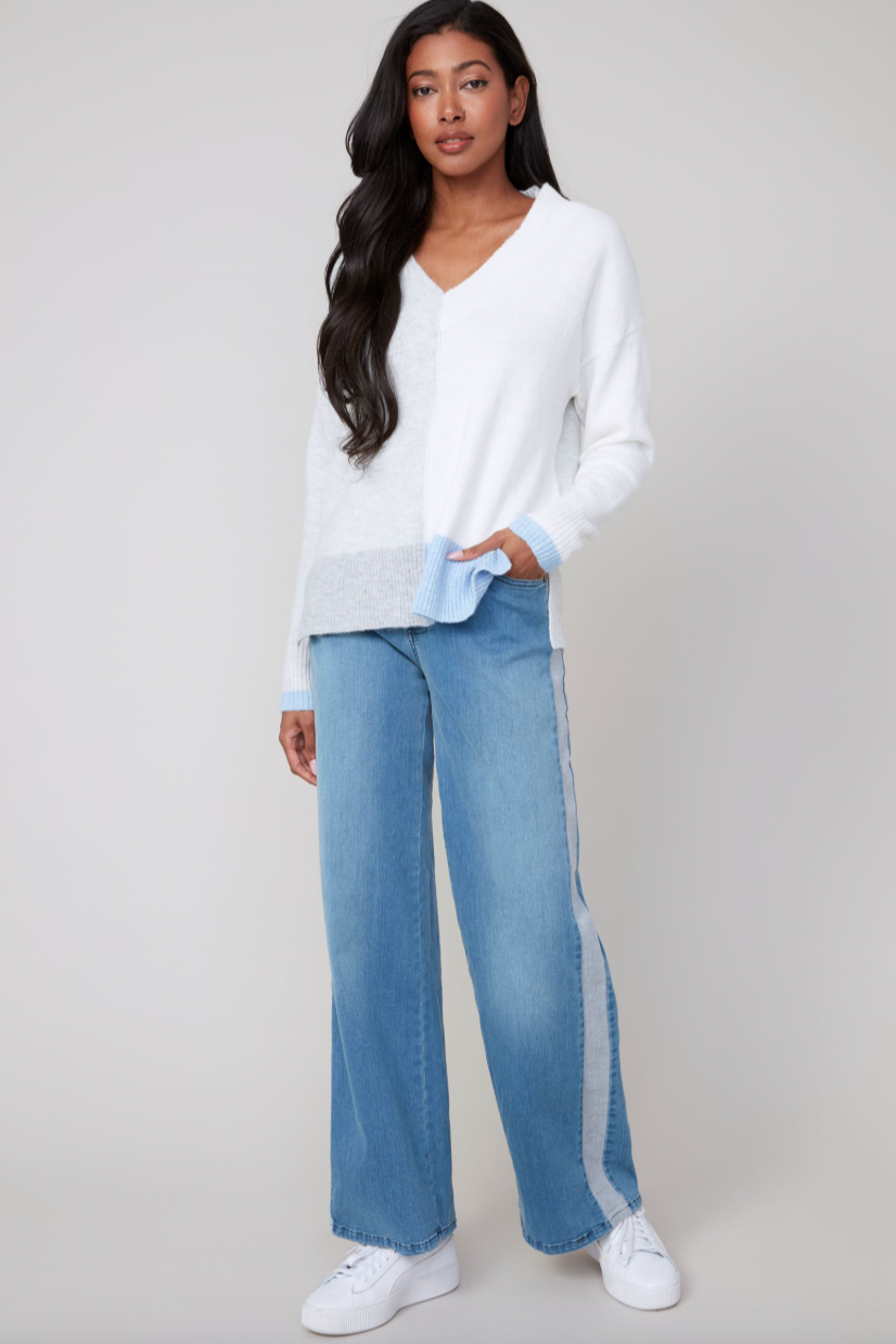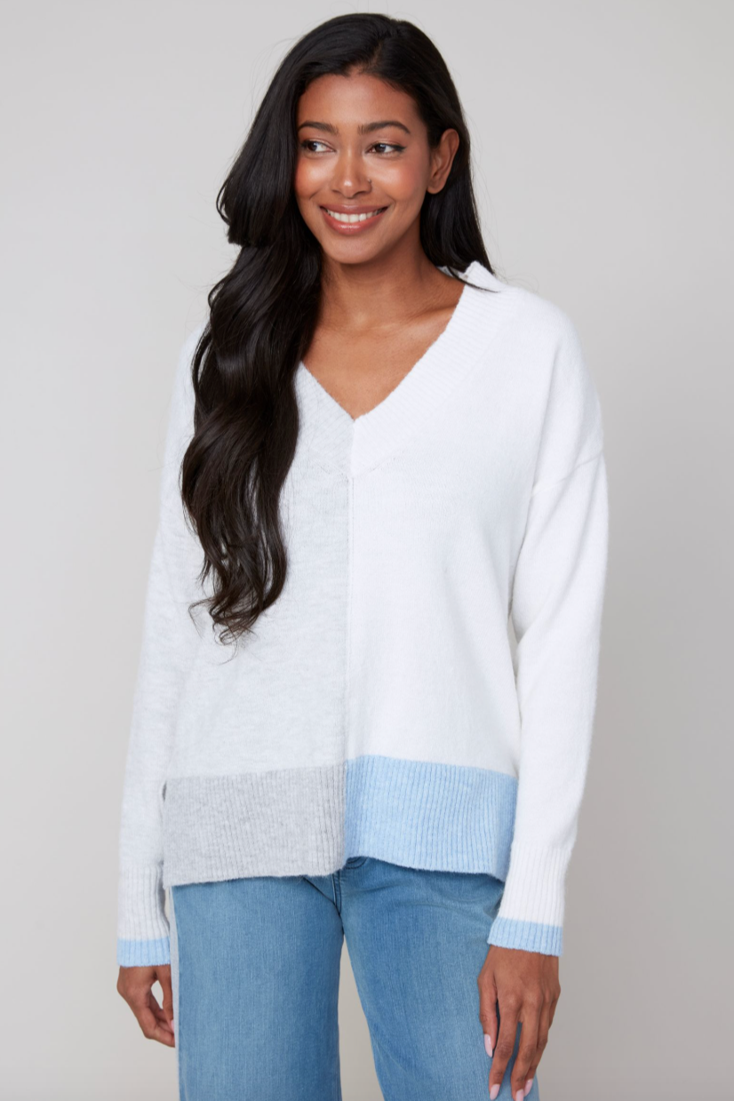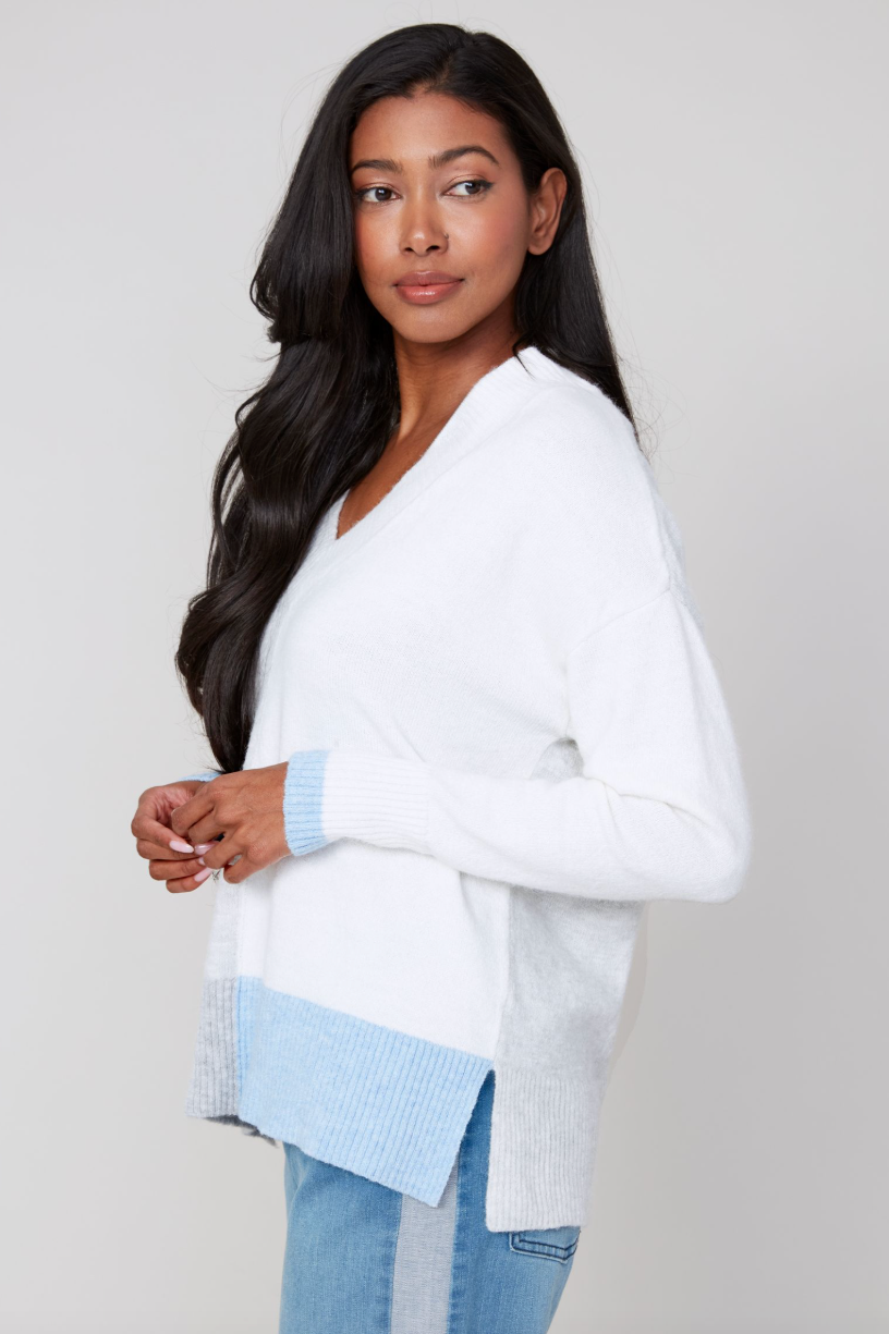 Color-blocking is shades of blue, grey and creme join the v-neck and long sleeve with vented straight hem.