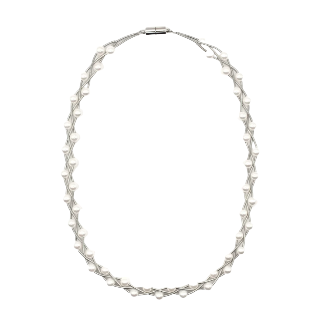 Braided Silver Wire Necklace With Small Mother Of Pearls Intertwined