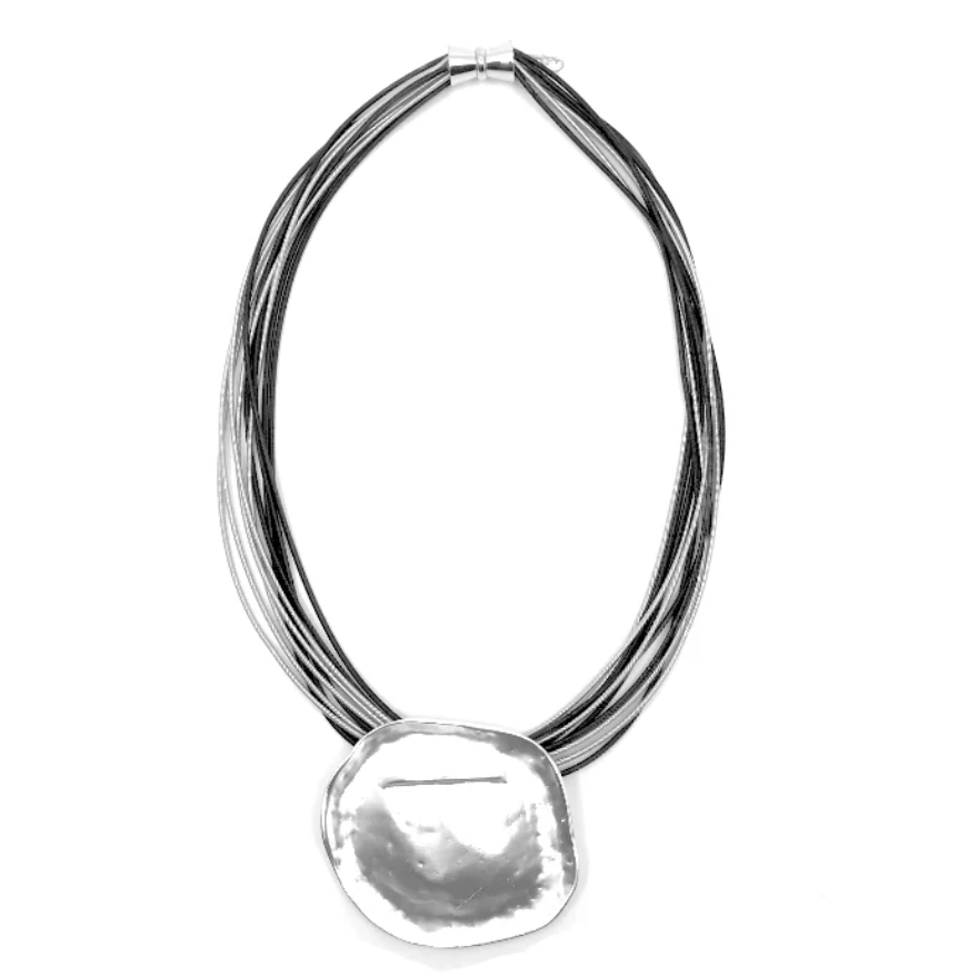 Black and Silver piano wire necklace with matte silver disc pendant.