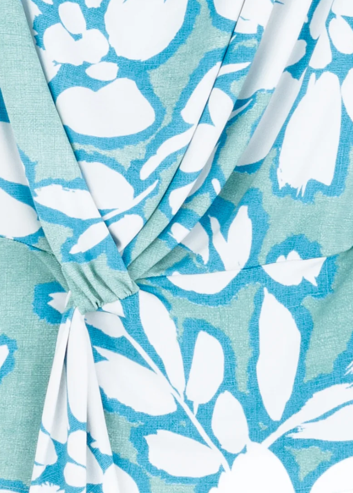 Bloom where the tropical breeze takes you, in the Paradise Petal Drape Neck Loop Front Top! An innovative top featuring cap sleeves, soft pleat details on the left shoulder, a feminine draped neckline that cascades to display a unique pull-through loop front detail that creates a chic, asymmetrical silhouette with a banded waist and straight hemline.