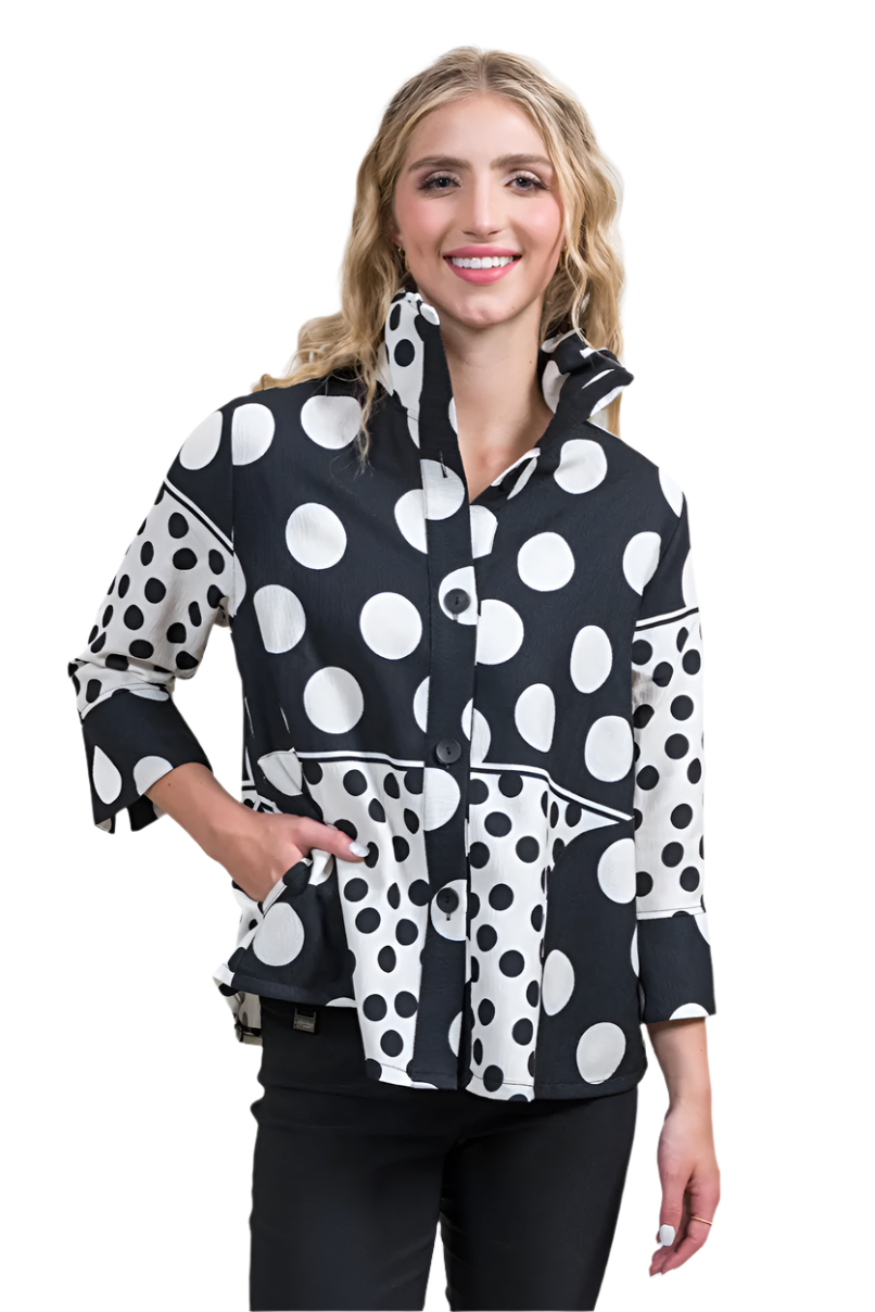 An exquisite display of artistic flair, this polka dot jacket adds instant style to any ensemble. Classic and fun, with 3/4 bell sleeves, and a wired collar to pop or not! Button front to wear open or closed, with a mix of patterns create great style!