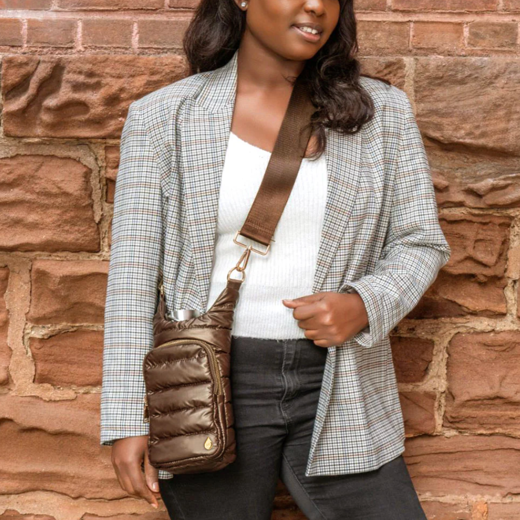 Stay hands-free and hydrated! Ideal for travel, festivals/events, walking the dog or generally life on the go! TWO large front pockets - The outer pocket is designed to fit a cell phone while the inner pocket has a place for keys, passport, credit cards & more. Large Water Resistant Pocket - Fits bottles 3.5” or less in diameter. Protect your essentials from spilled water. Ideal for water bottles, reusable cups & wine bottles (great gift)! Quality Material - Wide adjustable strap distributes bottle weight and compliments each bag. Stylish quilted fabric is durable, lightweight & trendy. Spot clean with mild detergent. . Size: 11”H x 5”W, can hold a water bottle up to 3.5 inches in diameter *Water bottle not included