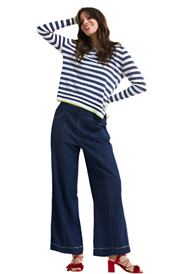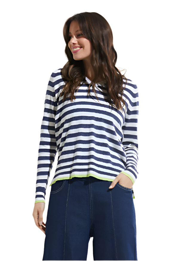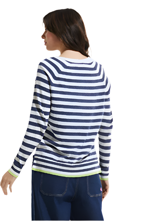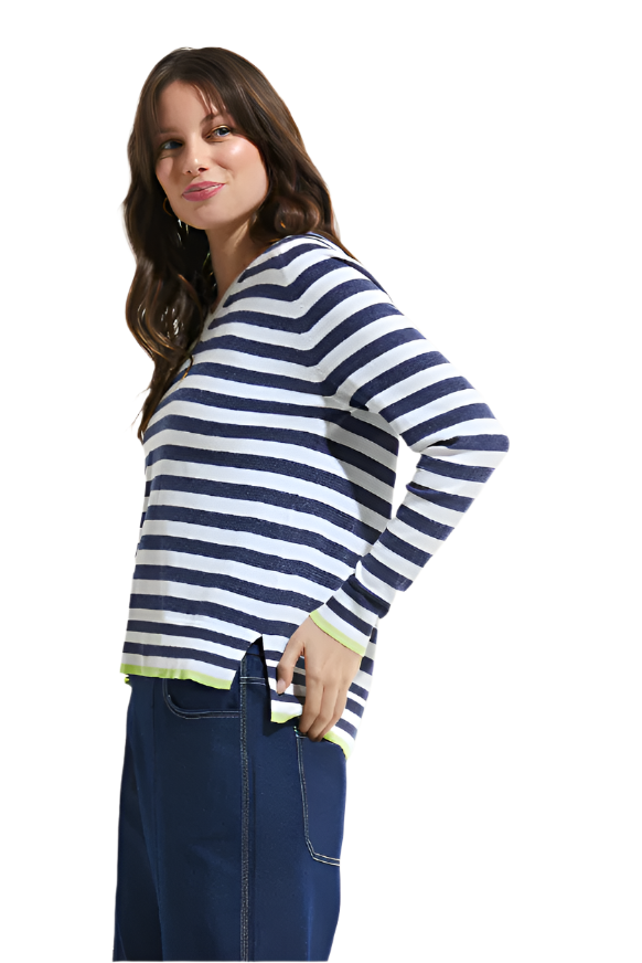 This lightweight sweater from Zaket & Plover features a V-neck, drop shoulder styling and small side slits for an easy fit. The pretty coral stripe on the bottom hem and cuffs adds a playful accent, a Zaket & Plover signature detail. The perfect blend of modern and classic, with a fun twist.