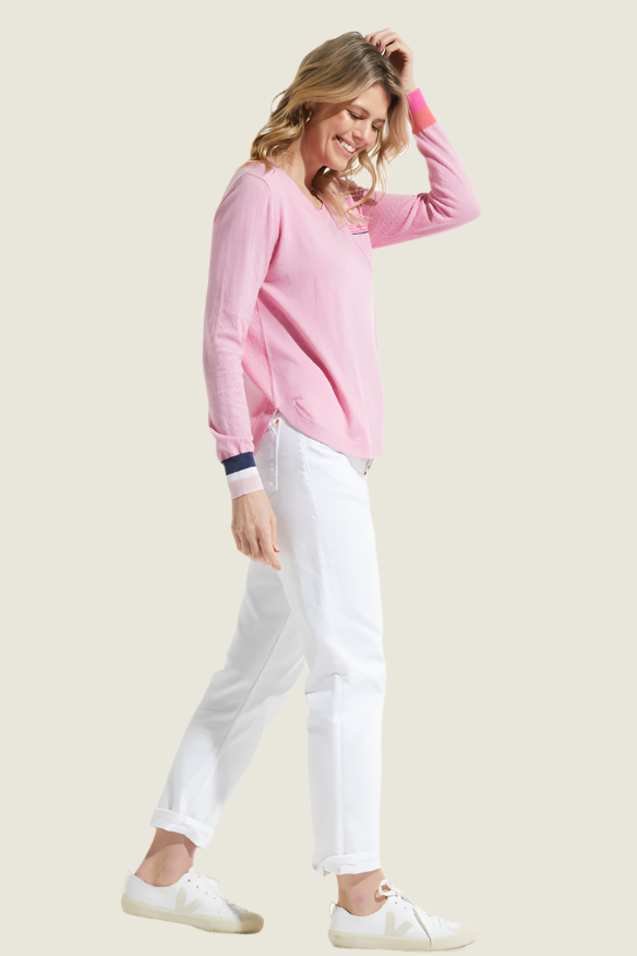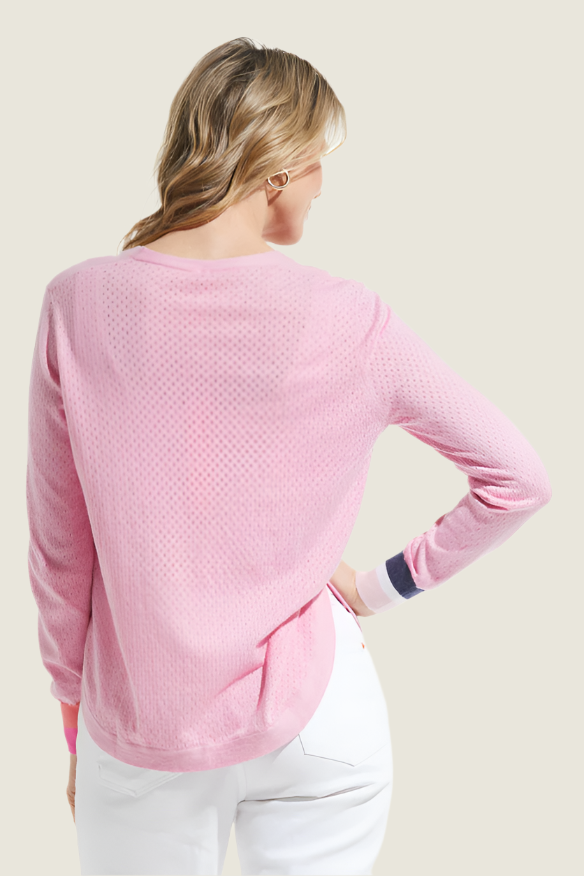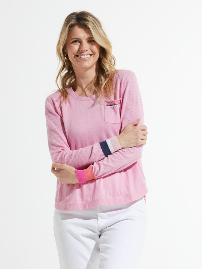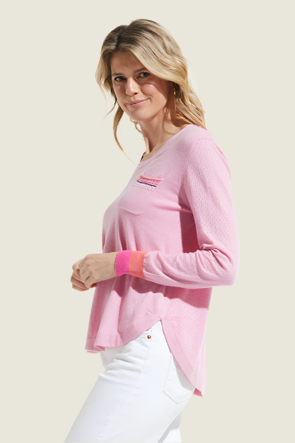 This lovely soft pink sweater from Zaket & Plover is lightweight and comfortable. Features a crew neck and a front pocket with delicate stitching detail and textured sleeves. Pops of color are a signature of Zaket & Plover and appear here on the cuffs, adding a playful contrast. Add this versatile and stylish sweater to your spring wardrobe!