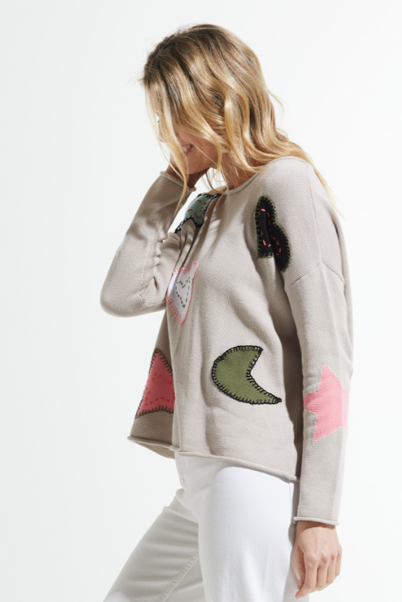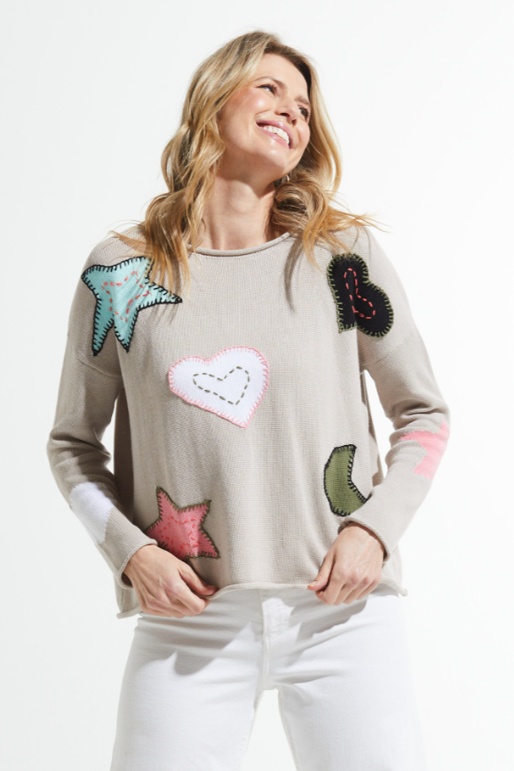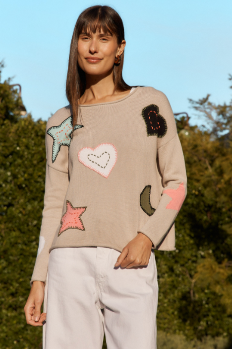 This Zaket & Plover's To The Moon Sweater, checks all the right boxes. Made in soft 100% cotton, it features a rolled neck, wrists, and waist for a touch of sophistication, and a pattern of hearts and stars on the front and sleeves for a touch of whimsy!