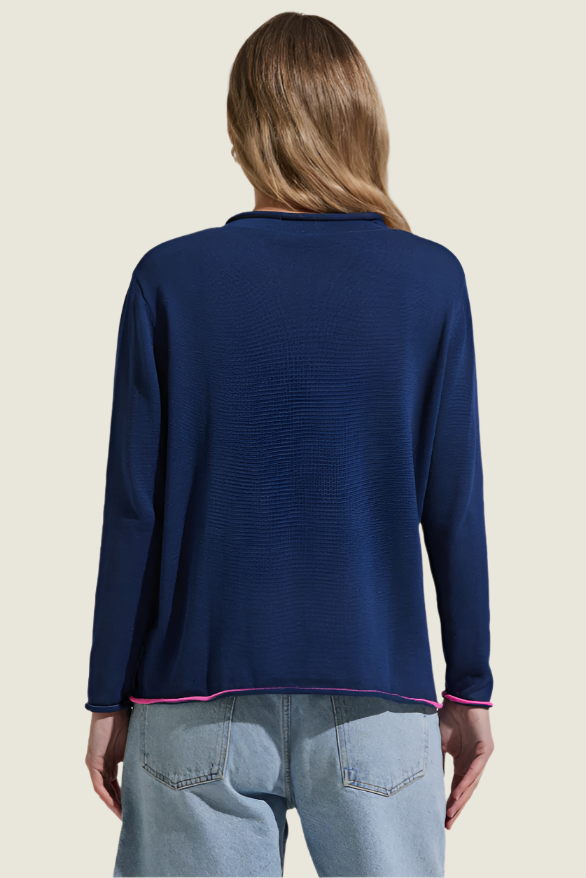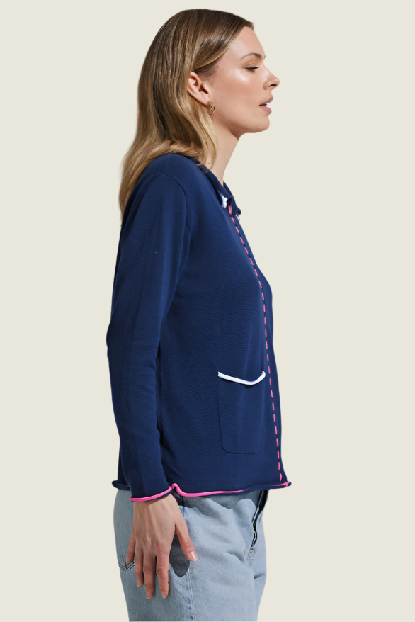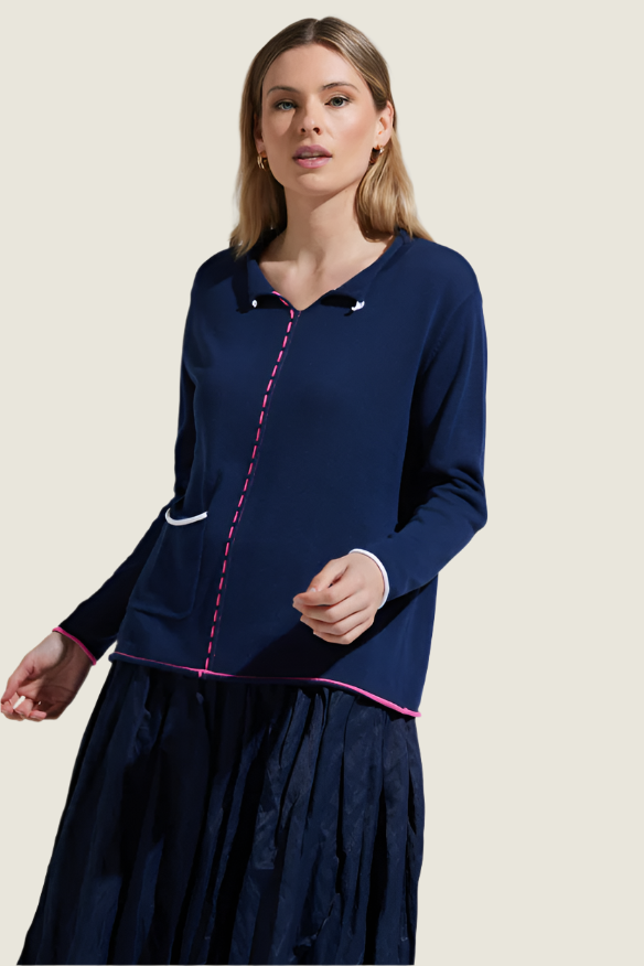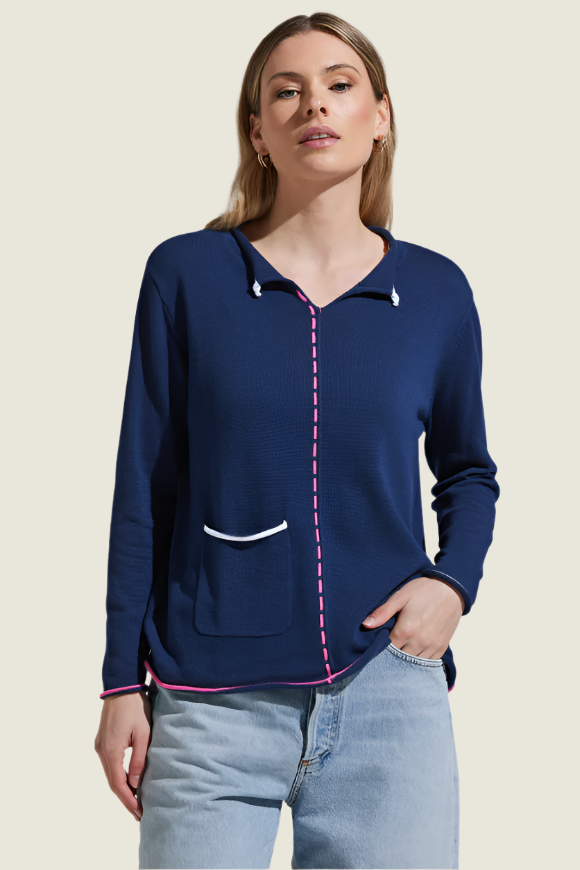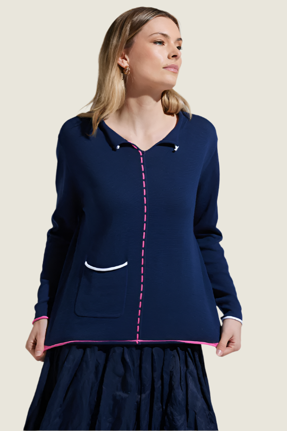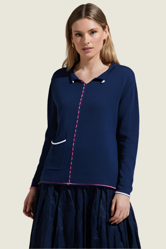 This V-neck sweater from Zaket & Plover has a fun, fold over collar with white stitching. The pink embroidery stitch down the front adds a delicate touch, a well as the white contrast edges, Zaket & Plover signature detail. There is also pocket on the lower right side.