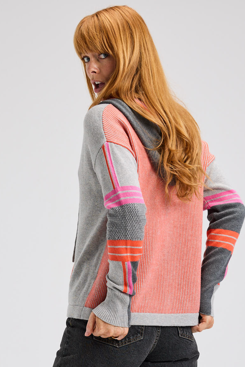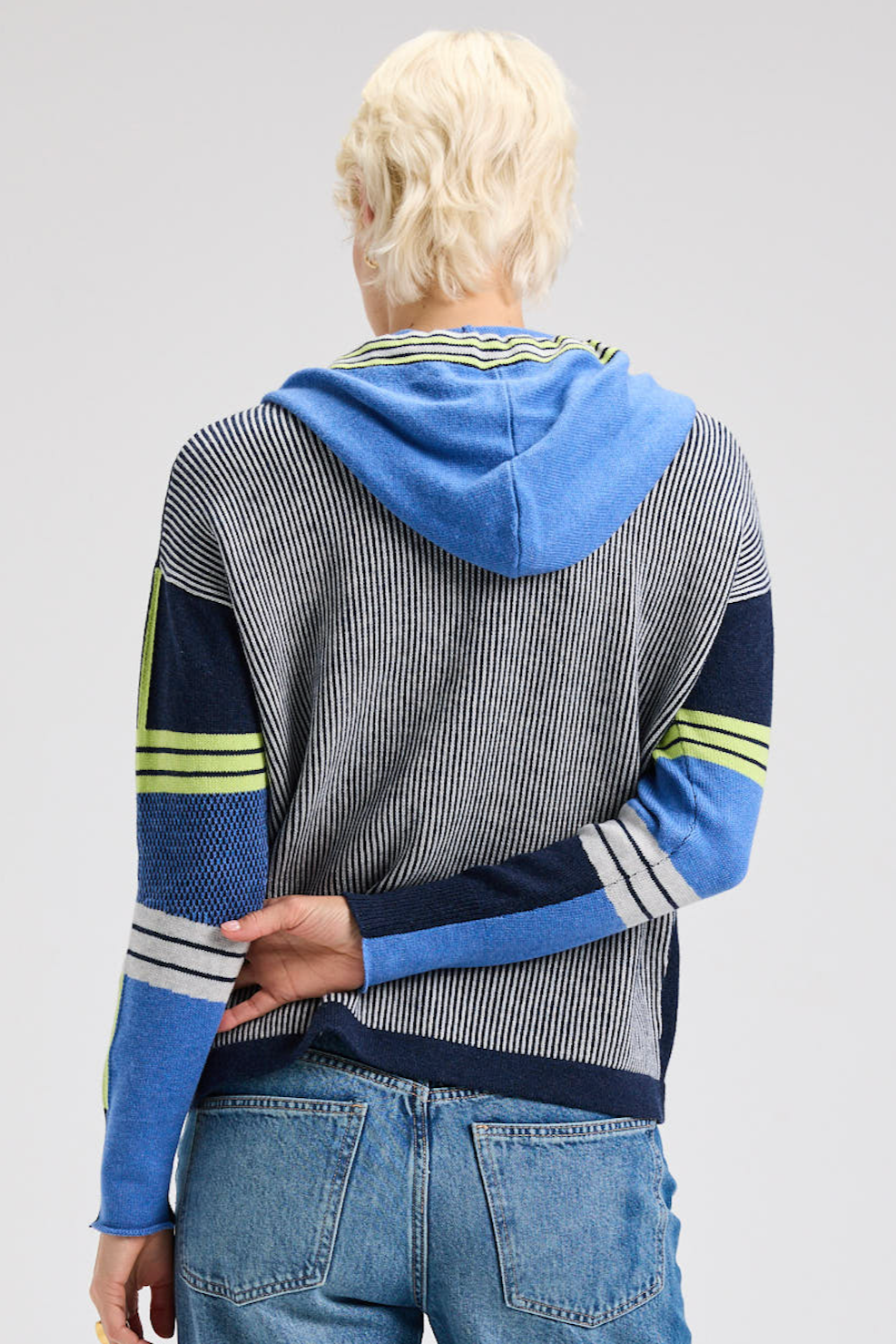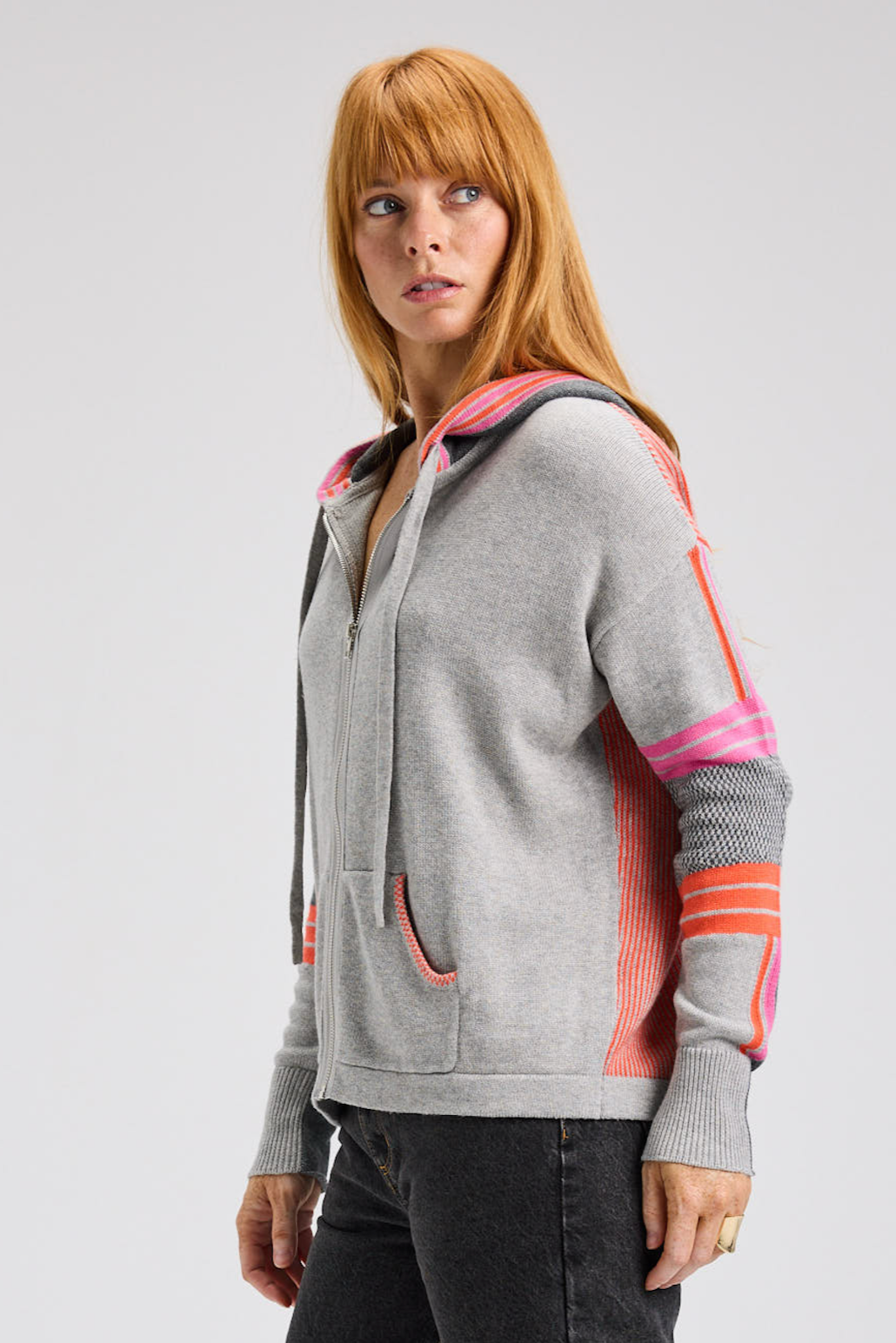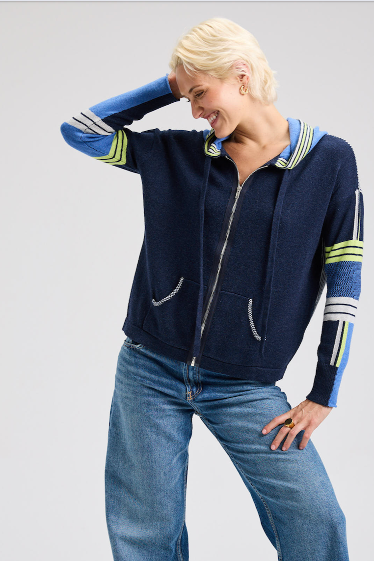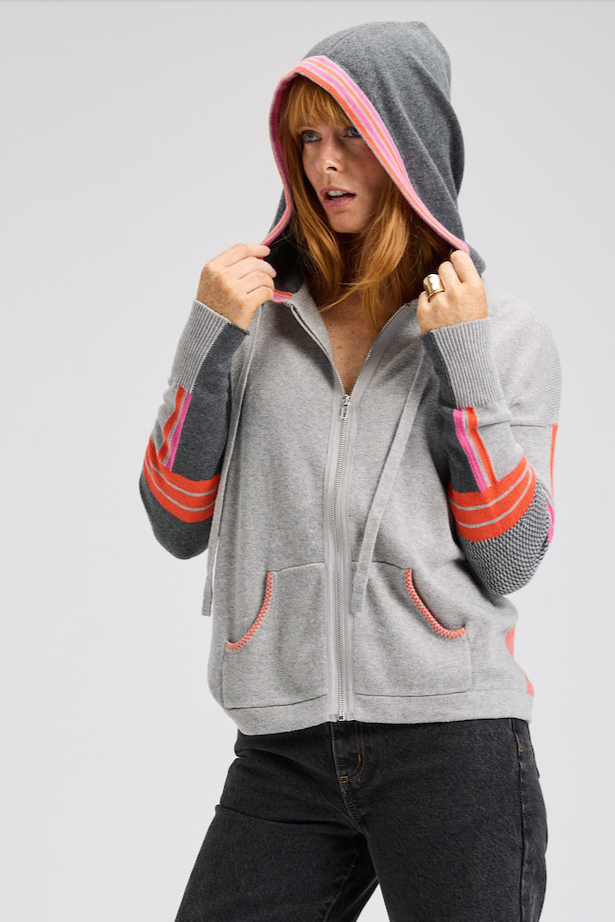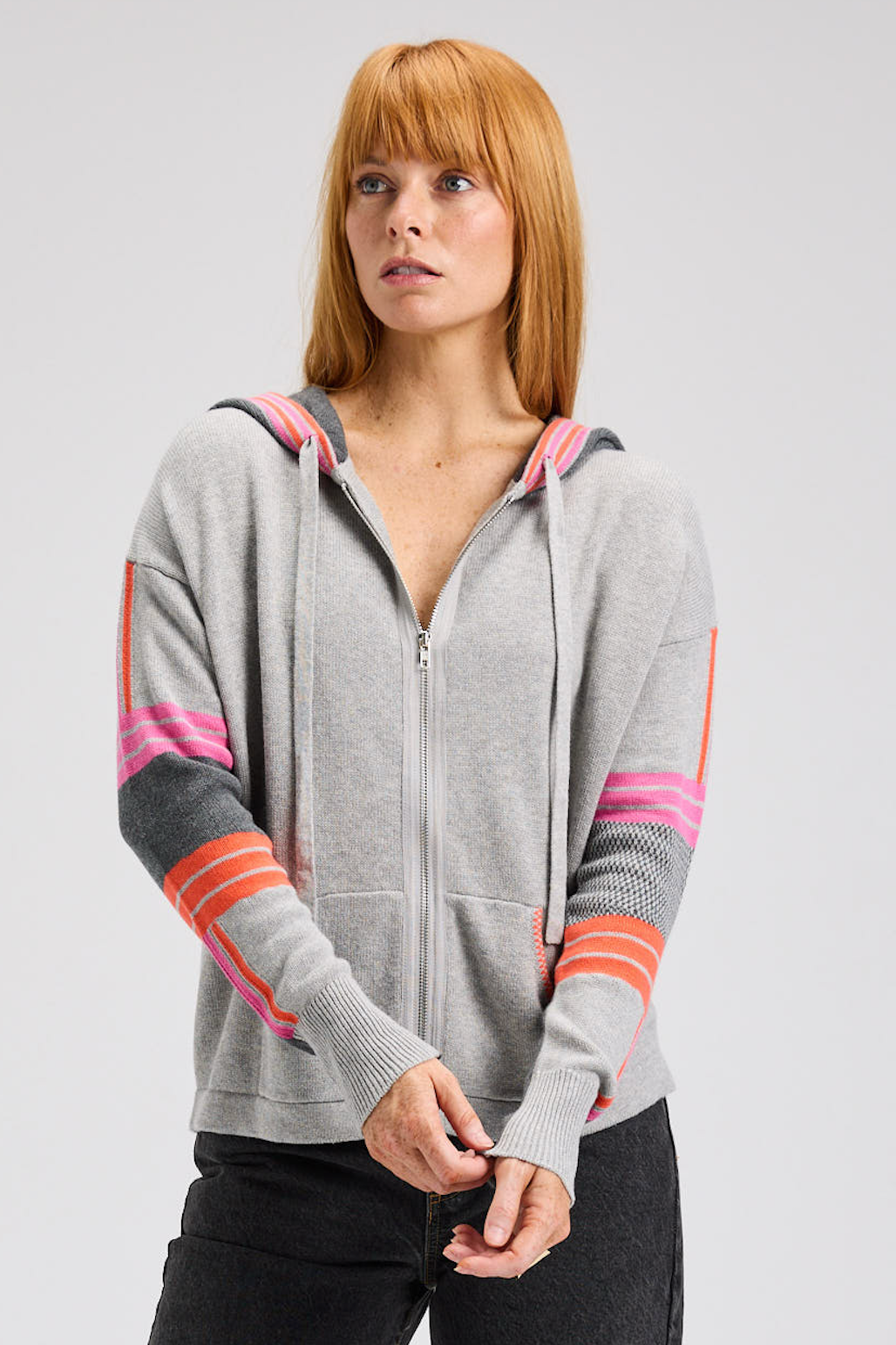 This cozy hoodie in a soft cotton blend features a relaxed fit, a full zip front, and a drawstring hood for ultimate comfort. The standout detail is the stripe design on the sleeves, adding a playful touch. Perfect for layering, this hoodie combines style and comfort effortlessly. Pair it with your favorite jeans or joggers for a chic, laid-back look.