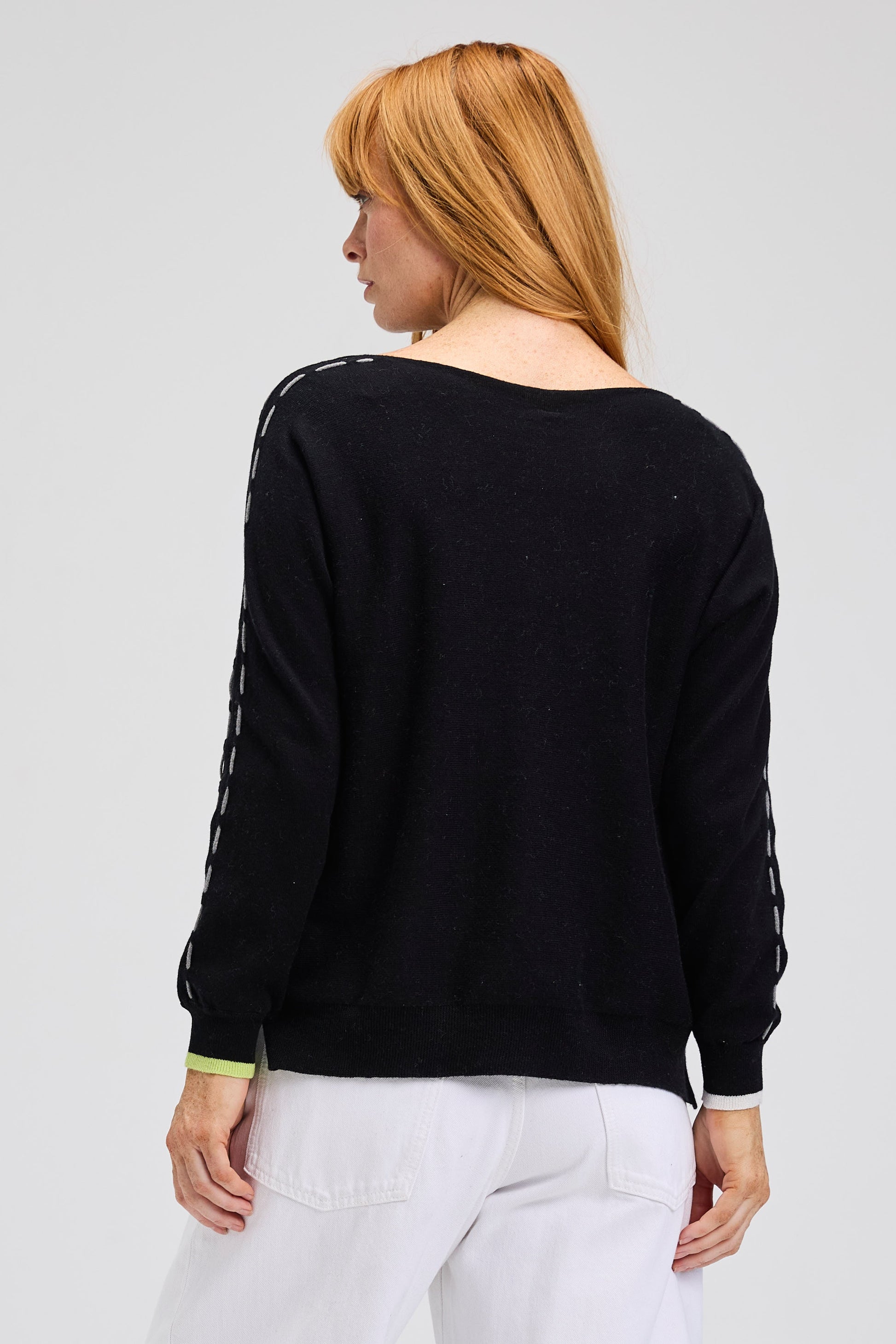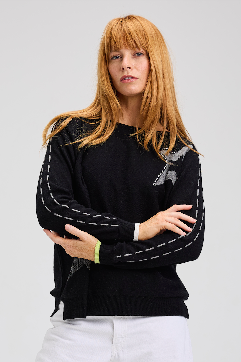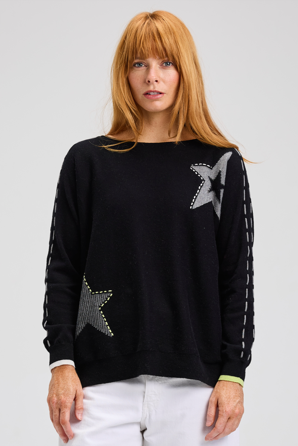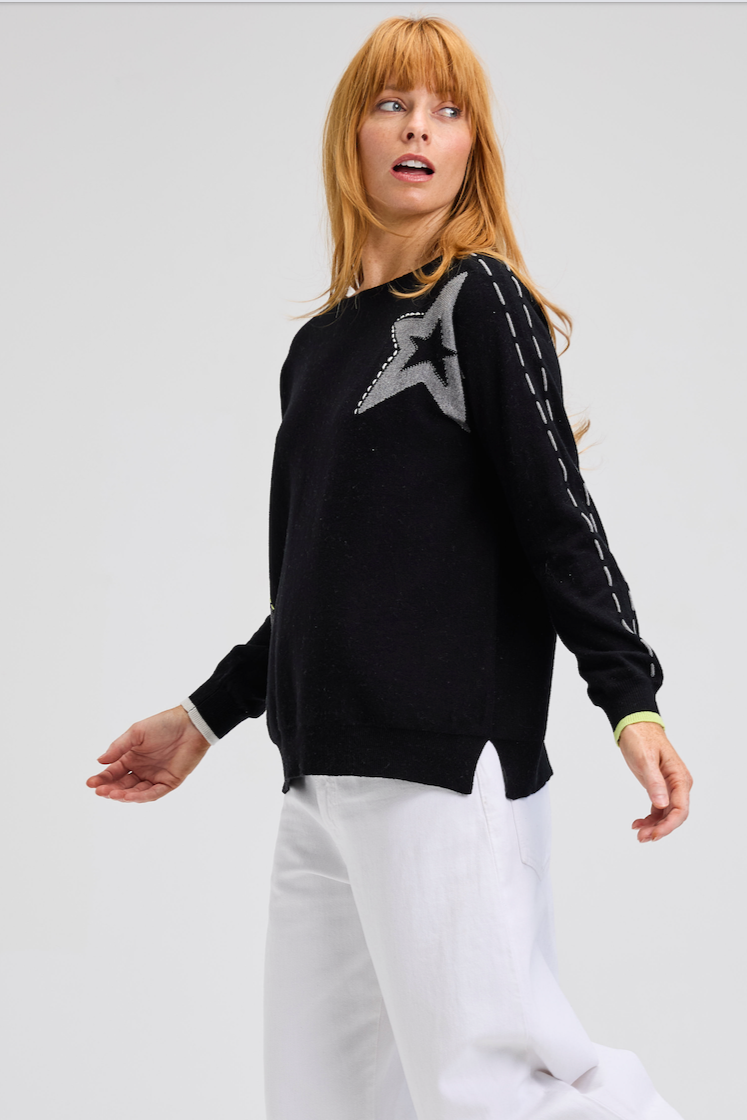 Wrap yourself in cozy charm with the Zaket & Plover Threaded Star Sweater in Black. This playful sweater features a unique threaded star design that adds a fun twist to your casual wardrobe. Crafted for comfort and style, its soft fabric keeps you warm while the denim-inspired hue brings a cool, laid-back vibe. Perfect for layering or wearing solo, this sweater turns everyday outfits into something special with a touch of starry sparkle. Embrace comfort and creativity in one delightful piece!95% Cotton, 5% Cashmere