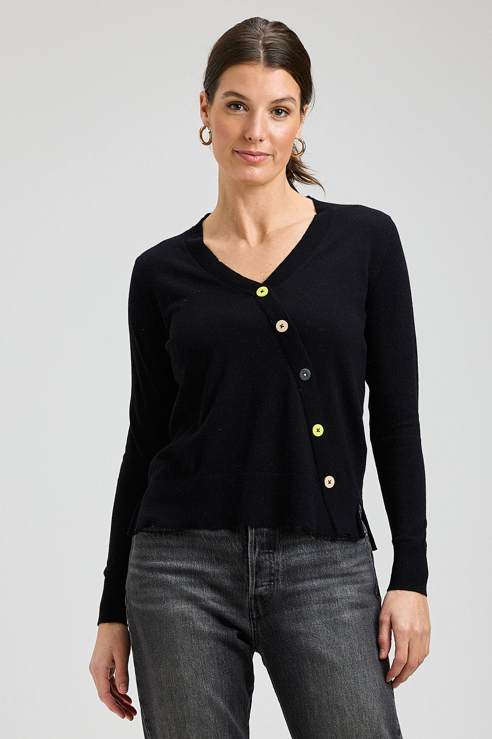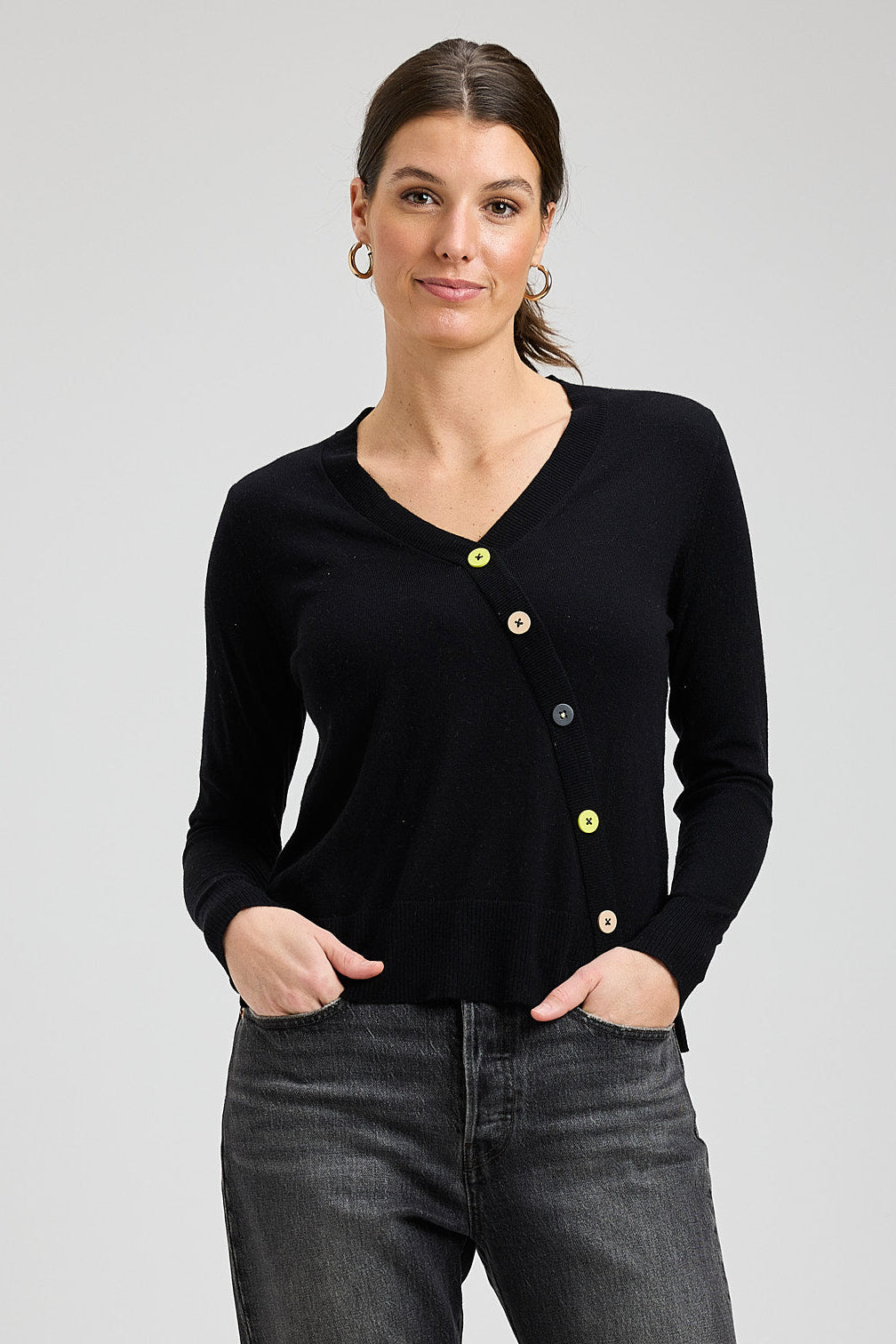 This is the sweater you'll reach for again and again (and again). The relaxed fit makes it perfect for layering or wearing solo, while that clever angled button detail keeps things interesting. It's thoughtfully designed for real life—whether you're heading to the office, meeting friends for dinner, or just want to look effortlessly put-together on a casual day.