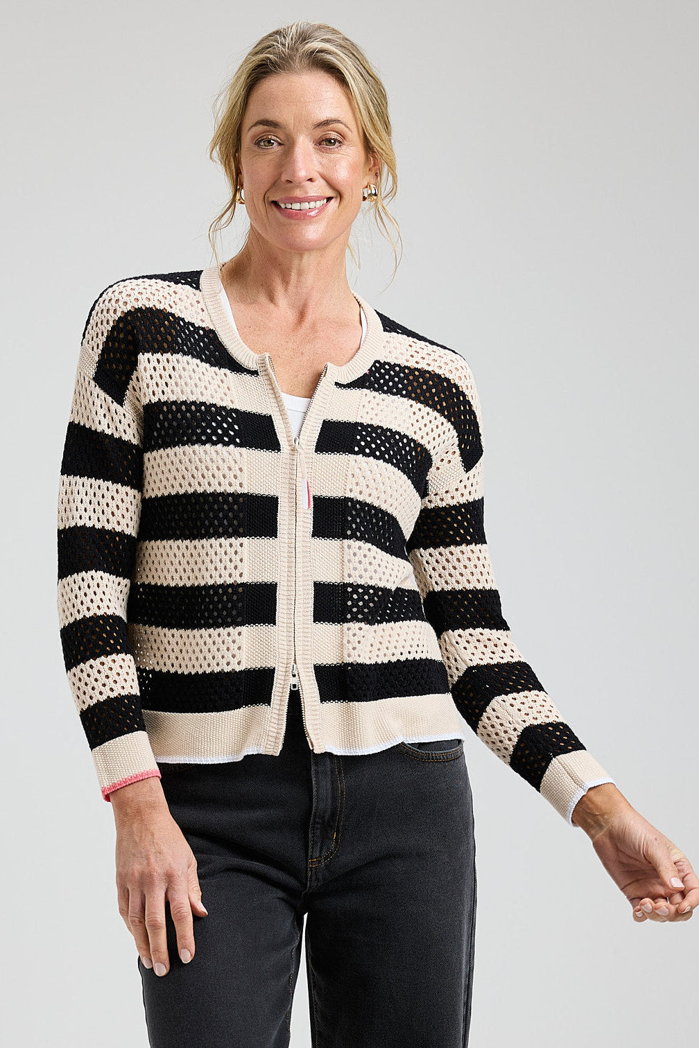 Discover your new favorite layering piece—the Zaket & Plover Pointelle Zip Cardigan combines airy eyelet knit texture with versatile styling options. This striped cotton cardigan is perfect for transitional weather and year-round layering.